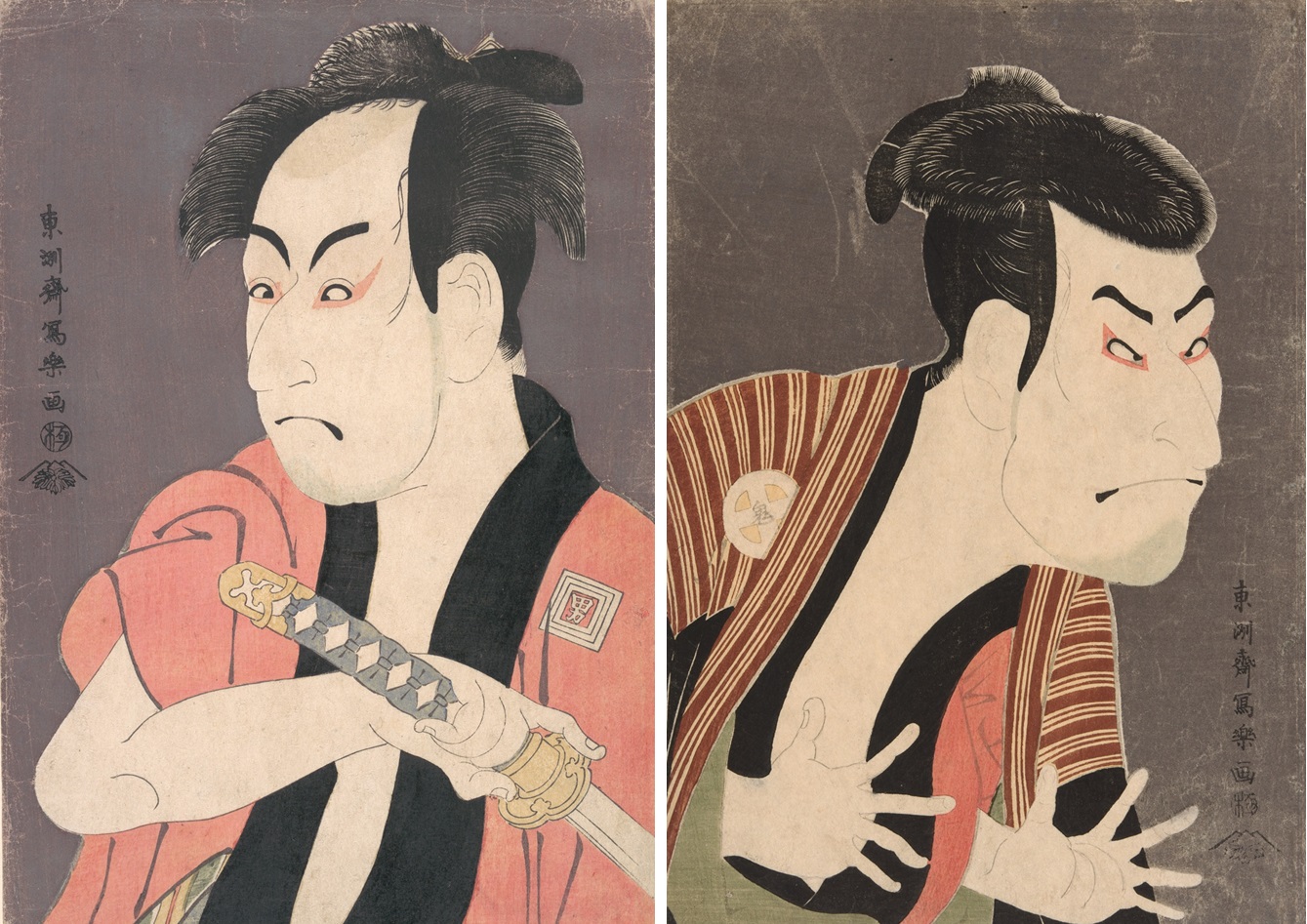 写楽は寛政6(1794)年に役者大首絵28 枚を発表。この記事でこれからご紹介する2枚は歌舞伎『恋女房染分手綱(こいにょうぼうそめわけたづな)』の登場人物で、とくに〝江戸兵衛(えどべえ)〟は写楽の代表作として有名な作品です。