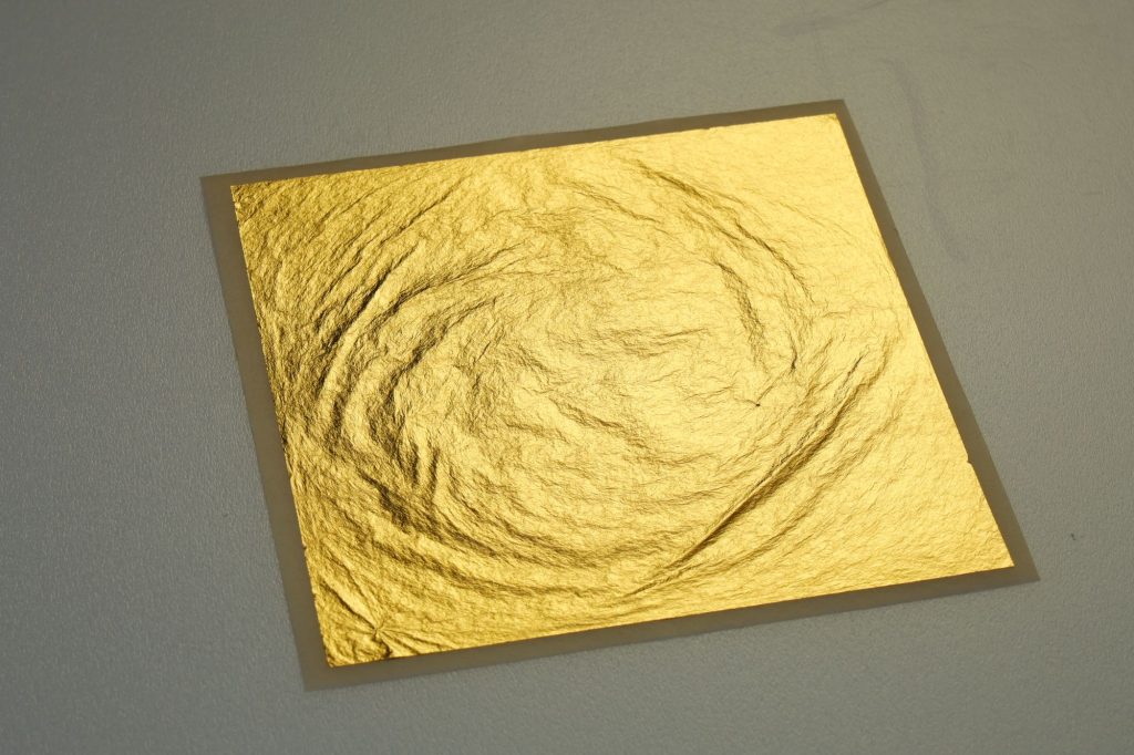 金箔は、「金」に銀や銅などをほんの少し混ぜた合金を、1万分の1ミリの薄さにまで伸ばしたもの。なぜ「金」100%で作らないのかというと、柔らかすぎて薄く伸ばしにくいからだそう。ちょっと混ぜものをした「金」を雁皮紙(がんぴし)という和紙に挟んで、ひたすら叩いて、息を吹きかけるとふわっと飛ぶほどの薄さにまで伸ばしていきます。