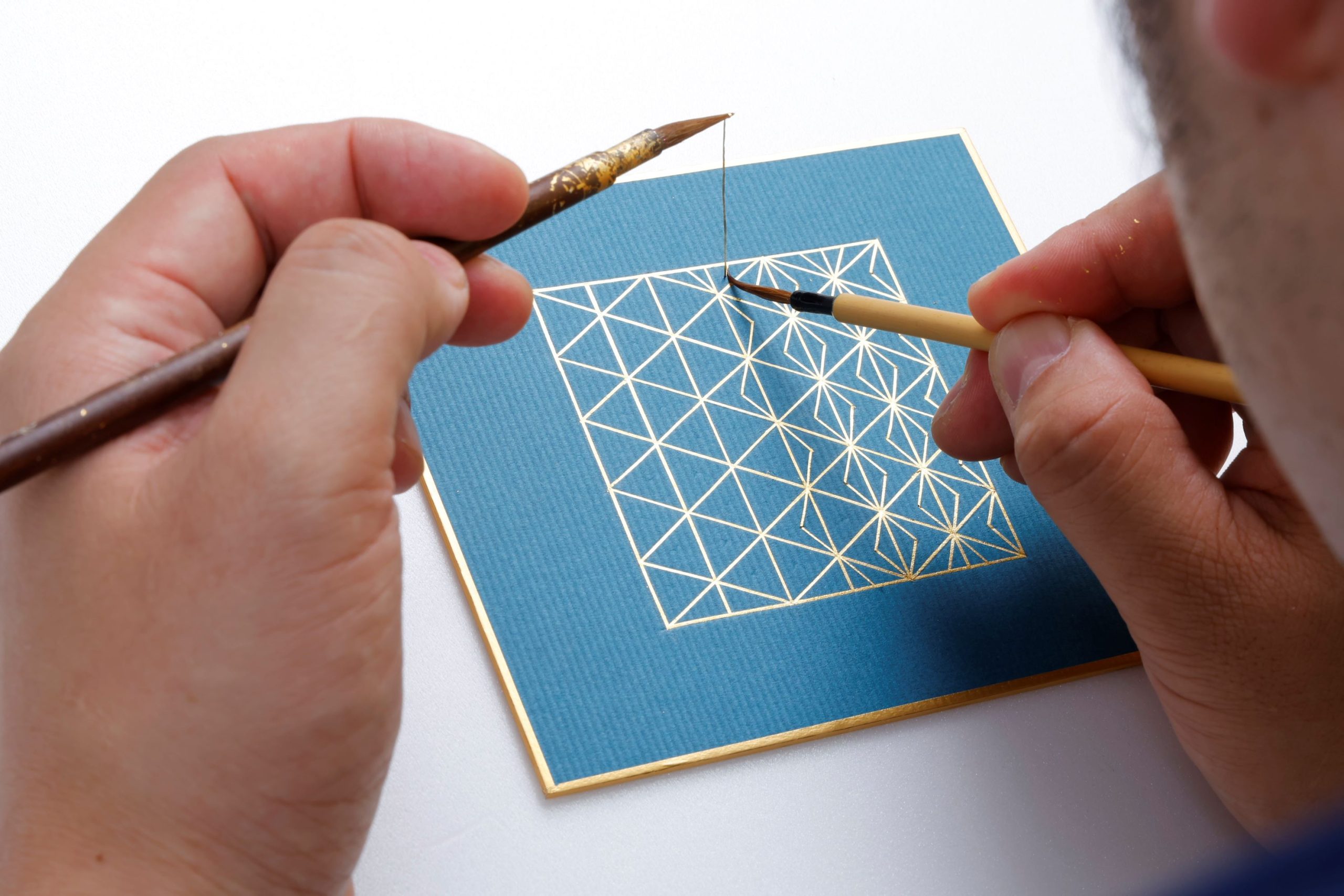 本書に載せるためにベーシックな模様を截金で描いていただきましたが、その様子を横から見ていた我々取材スタッフは「えっ!? 何!? すごい…」と驚くばかり。糸ぐらいの細さに切った金箔を、2本の筆で縦横無尽に操り模様を描いていく様は、まるでイリュージョニストかのようでした。