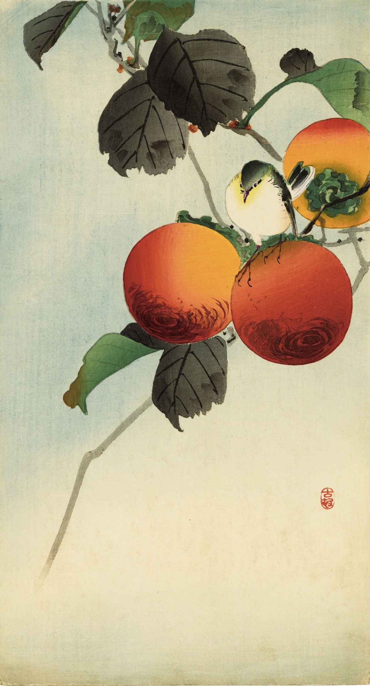 熟れた柿をがっちり足でつかみ、「やった~」という喜びが全身から伝わってくるメジロさん! ワクワクしちゃって、尻尾もピンと上に伸びています。かわいいな~。でも、こんなにかわいい顔をして、これからものすごい勢いで柿をついばみ始めるのですよ、きっと。なんでわかるのかって? 実は、うちの庭の梅の木にも、花が咲くと毎年メジロさん達がやってくるのです。彼らは、枝がブンブン揺れるほどの勢いで梅の花をガシガシつつきます。おかげで花びらも派手に散るので、「もうちょっとやさしくして〜」と言いたくもなるのですが……。でも彼らが来た後はいい感じで梅が実るので、受粉に貢献してくれているようです。そのようなわけで、我が家ではメジロさんの姿を梅の花とセットでイメージしていたのですが、柿も大好きだということが今回の小原古邨の浮世絵からわかりました。それにしても、いつも家に来るメジロさんと比べて、このメジロさんはお腹がまんまるで太っている(笑)。鳥の世界でも、秋はやっぱり食欲の秋なのかしら?!