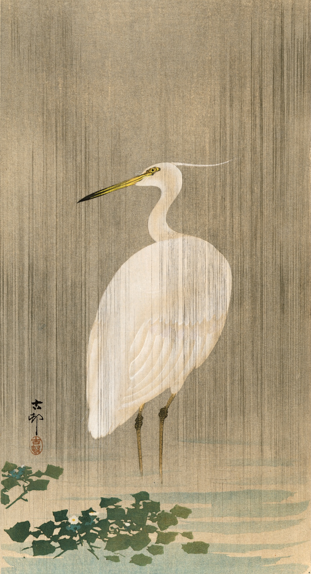 日本の絵画には、雨を描いた絵がかなり多いんです。しかも、雨を筋で描いていたりします。有名なのは、歌川広重の『名所江戸百景 大はしあたけの夕立』(安政3年=1856年)。隅田川に掛かっていた「大はし」(現在の東京都江東区の新大橋の近くにあった橋)を渡っていた人々が、にわか雨から走って逃げている様子を風情豊かに描いた素晴らしい錦絵です。雨を筋で描く手法は、江戸時代半ばに錦絵の創始者として活躍した鈴木春信あたりの絵師による発案と考えられていますが、小原古邨もまた、錦絵の伝統を受け継ぎつつ、雨を筋で描いている。それがこの『雨中の小鷺』です。けっこうな雨が降っているように見えますが、小鷺は慣れっこなのか静かにたたずみ、逃げる様子はありません。雨も自然の一部として受け入れているのでしょう。