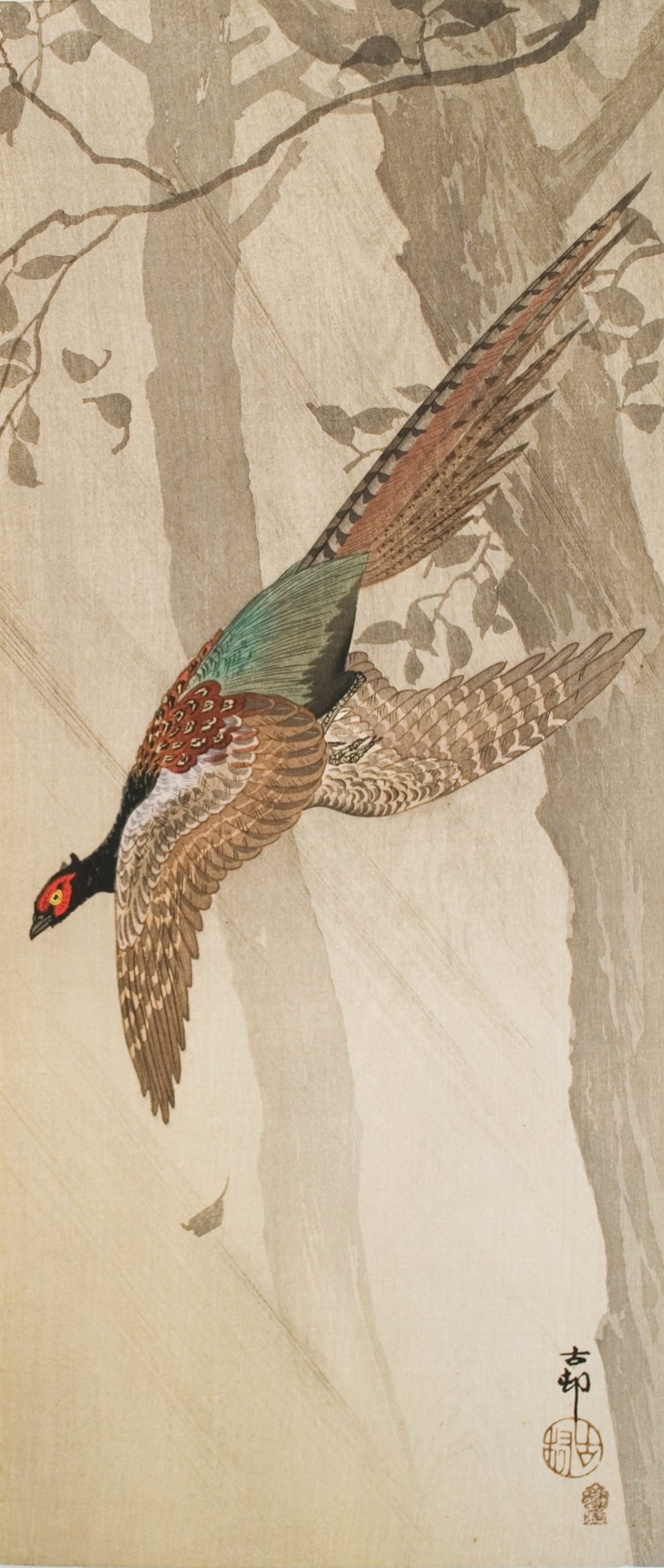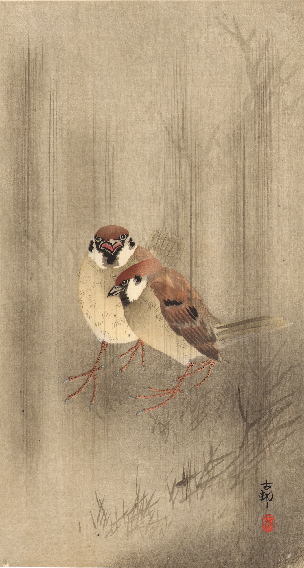 たわくしは、日本に雨を描いた絵画が歴史的にかなり多いことから、人々もまた、四季折々の味わいのある風景として楽しんできたのではないかと考えています。そして古邨は、この絵のほかにも何点も雨中の鳥を描いています。それは絵師自身が、雨の風景を味わっていたからでしょう。ただし、必ずしも江戸時代の錦絵のように筋で描くものばかりではなく、刷毛で引いたような表現もしています。抜群のテクニックを持っていた画家ゆえの、表現のバラエティなのでしょう。