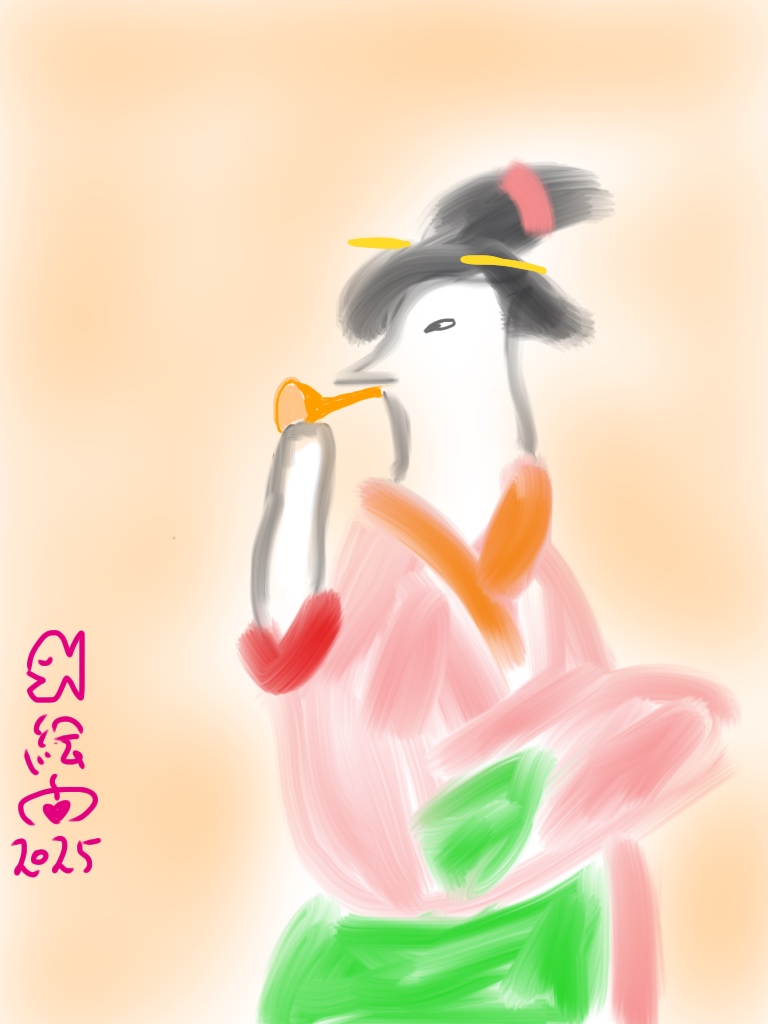 田鳧が「田んぼの貴婦人」であるならば、江戸時代に流行ったびいどろ(ガラス製の遊具の一種)を吹いたこともあろうかと。くちばしをうまく使うと吹けるかな!
