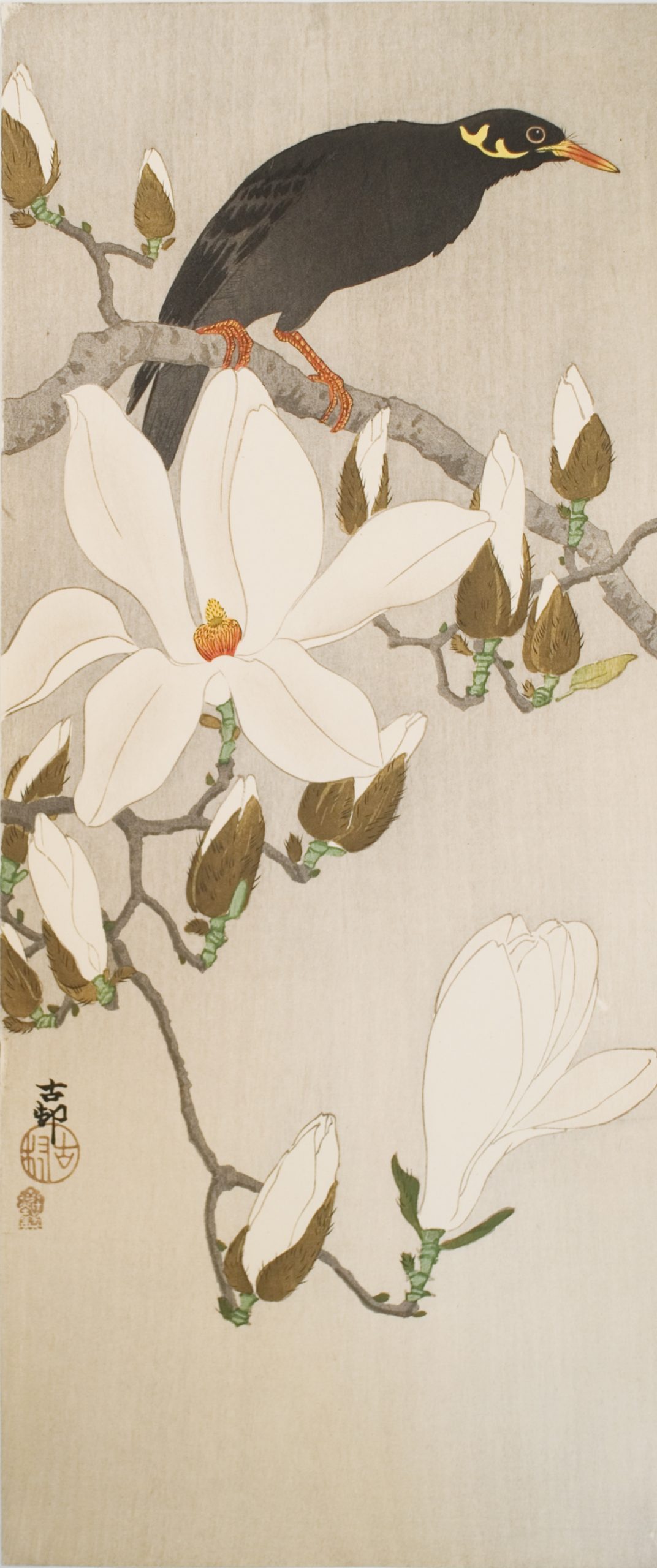 つあお: 小原古邨は大正時代を中心に活躍した絵師だけど、摺師と彫師が別にいて下絵を描いていたそうです。つまり、江戸時代の浮世絵師のような役回りで木版画制作に臨んでいた。