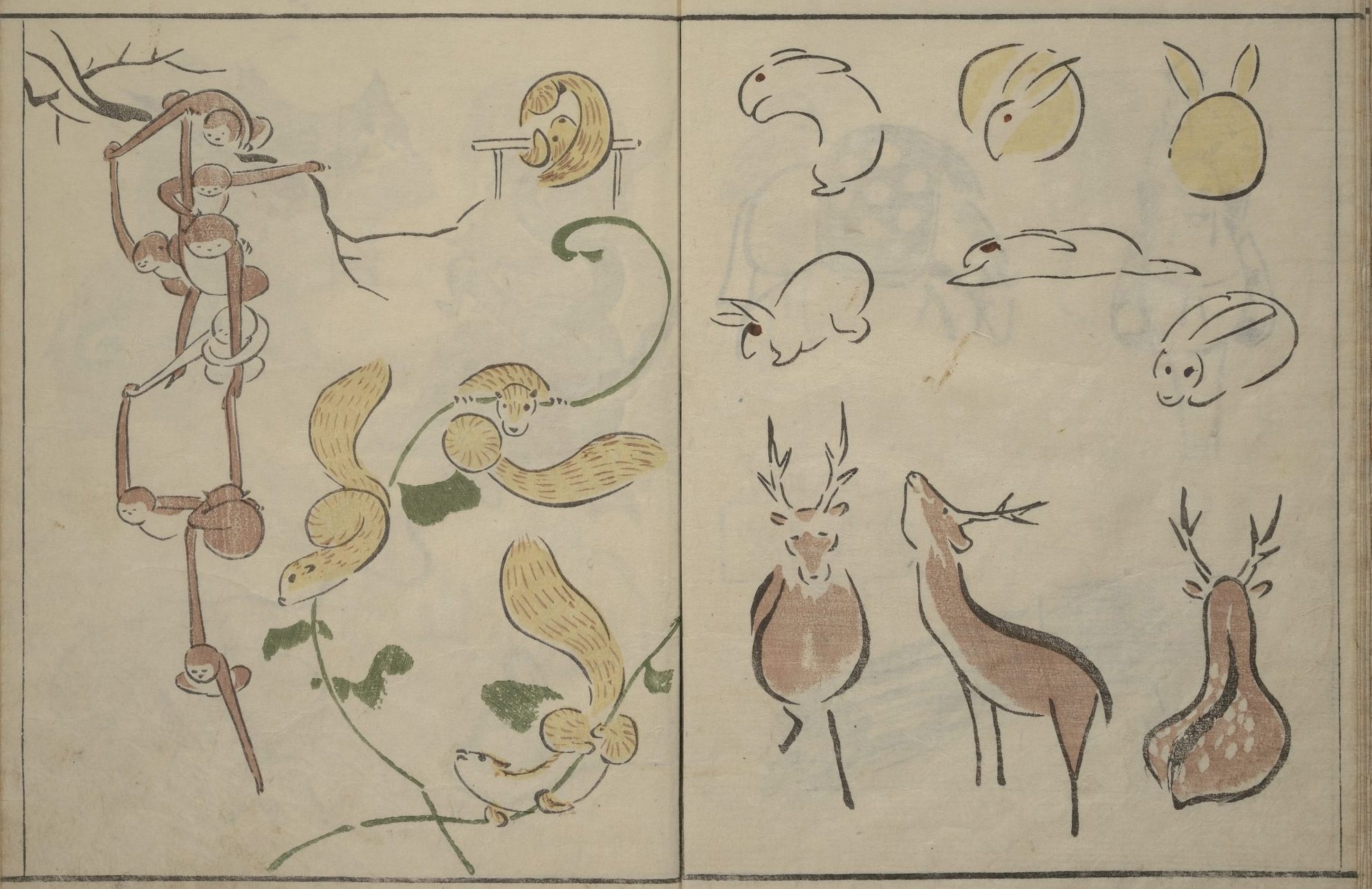 さらり、ゆるりと最小限に筆を運ぶだけで、小動物のいじらしさや猛獣のおかしみまで表してみせた鍬形蕙斎。まるで魔法のようなその手腕。実は葛飾北斎の絵手本「北斎漫画」も、略画式から着想を得たといわれているのだそうです!