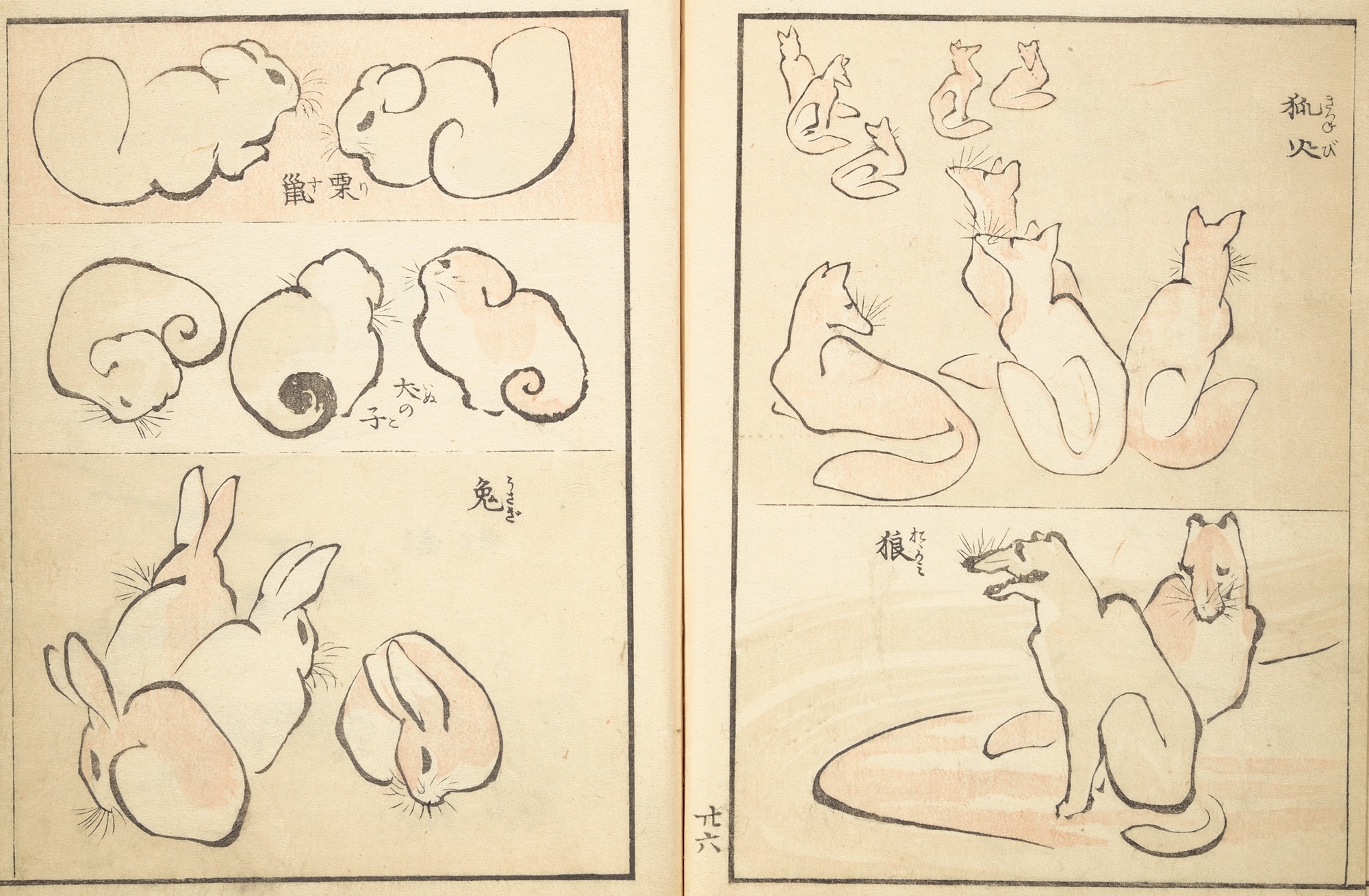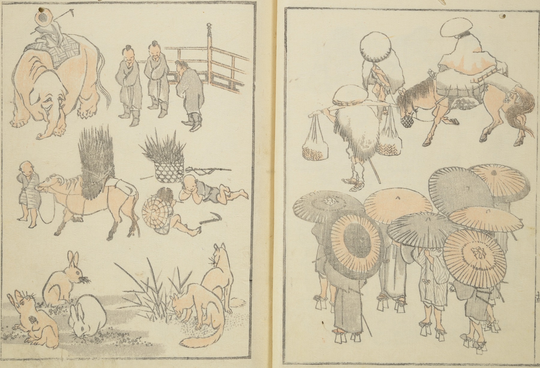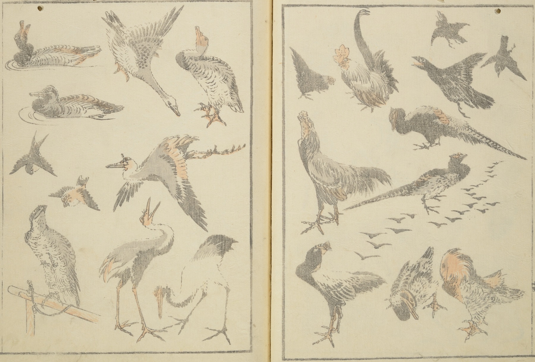やがて、人や動物、鳥や虫、山川草木など、あらゆるものの絵手本を描くようになり、上級者向けの参考図案集という内容の『北斎漫画』や、かわいい略画など、数多くの絵手本を残しました。