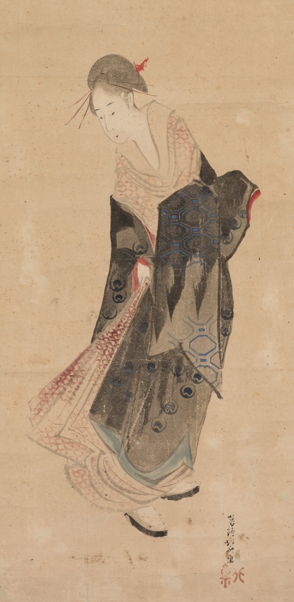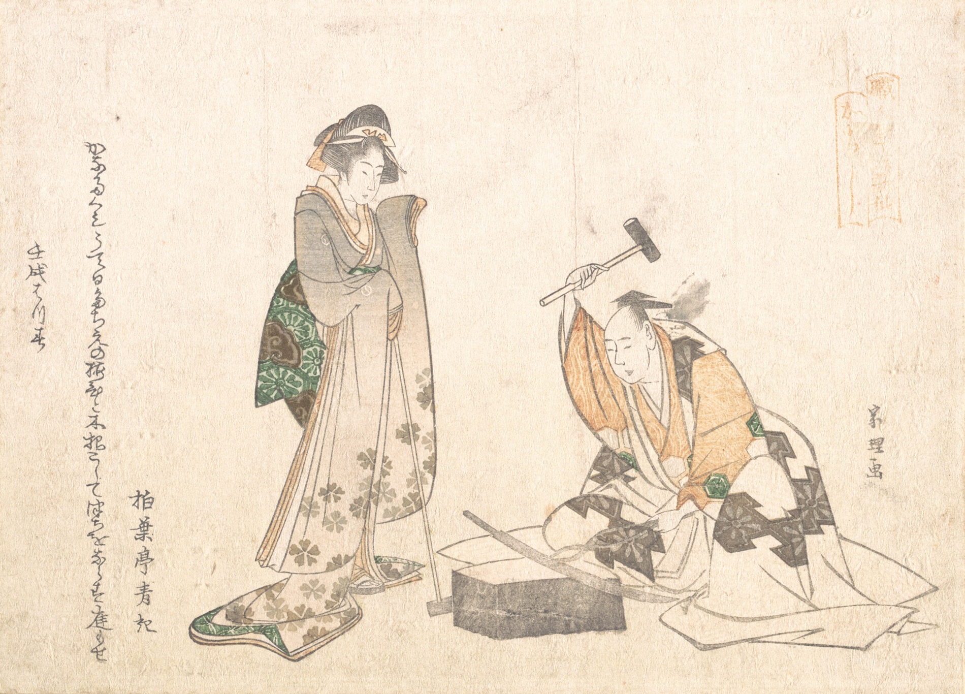 独り立ちの美人画ではないが、女性のプロポーションの美しさには目を見張る。右下の署名が「宗理画」。『職人三十六番(しょくにんさんじゅうろくばん)』葛飾北斎 1802年 メトロポリタン美術館 The Metropolitan Museum of Art, The Howard Mansfield Collection, Purchase, Rogers Fund, 1936