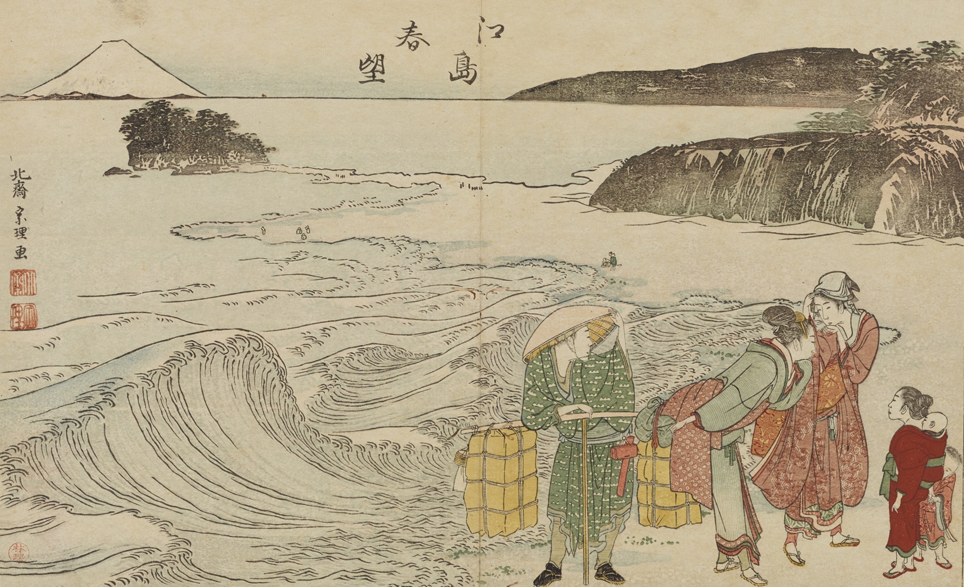 浅草庵市人の序がある狂歌絵本『柳の糸』の一図。司馬江漢の「江の島図」から洋風表現を学んだことが、構図と山や波の描写から見て取れる。『江島春望(えのしましゅんぼう)』葛飾北斎 寛政9(1797)年 東京国立博物館 出典:ColBase (https://colbase.nich.go.jp)