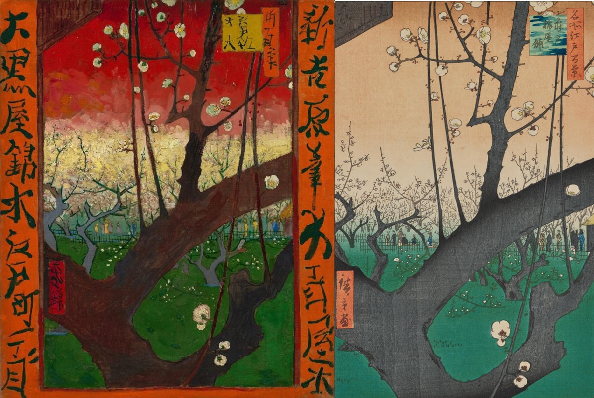 左/『Flowering Plum Orchard (after Hiroshige)』フィンセント・ファン・ゴッホ 1887年 ファン・ゴッホ美術館 Van Gogh Museum, Amsterdam (Vincent van GoghFoundation) 右/『名所江戸百景・亀戸梅屋舗(かめいどうめやしき)』歌川広重 安政4(1857)年 東京国立博物館 出典:ColBase (https://colbase.nich.go.jp)