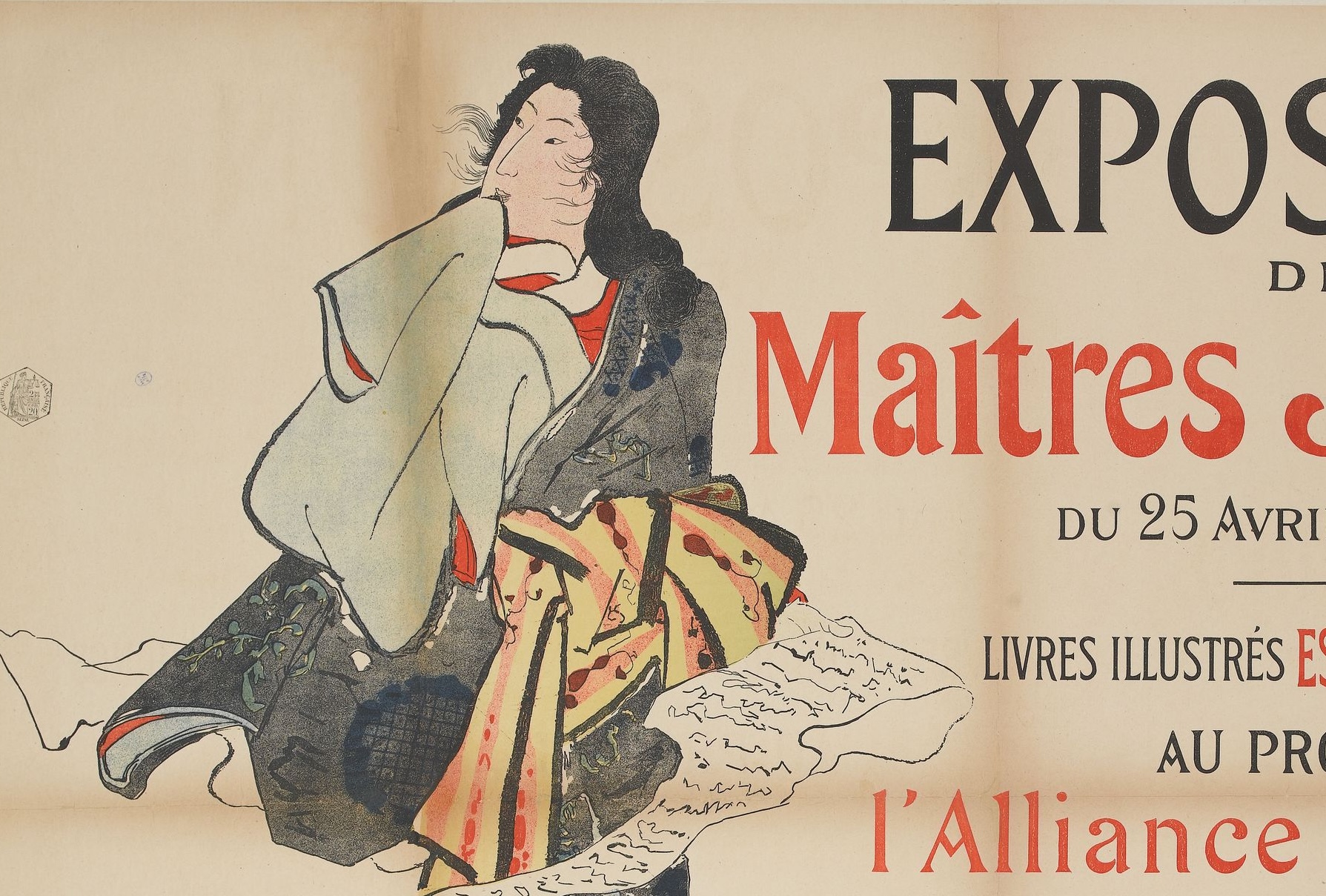 1867年の第1回パリ万国博覧会以来、西洋の観衆が日本の工芸品や浮世絵を目にする機会は多くありました。しかし、日本版画に特化した初の大規模展覧会は、ビングが1890年に開催した「日本版画展」でした。この展覧会では、17世紀初頭の鳥居派の浮世絵師から、最後の巨匠のひとり河鍋暁斎(1831–1889)に至るまでの作品が紹介されました。ビング自身の重要なコレクション(『神奈川沖浪裏』(1830–32年頃)を含む)に加え、彼の顧客であり同志でもある日本趣味愛好家、シャルル・ジヨ(1853–1903)、作家フィリップ・ビュルティ、宝飾商アンリ・ヴェヴェル(1854–1942)、そして何より浮世絵研究の第一人者であった林忠正(1856–1906)らからの貸出品も展示されました。展覧会のポスターは、フランス・ベル・エポックのリトグラフ作家で「近代ポスターの父」と称されるジュール・シェレ(1836–1932)が制作しました。
