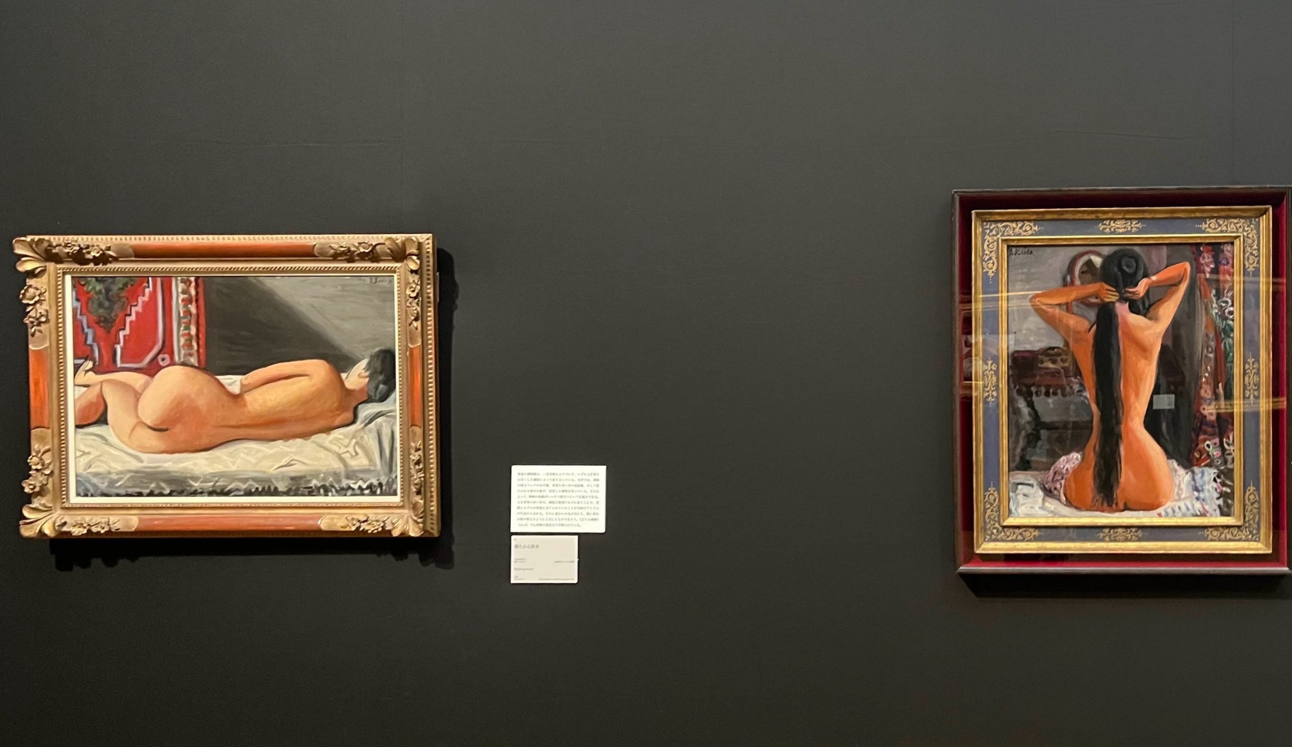 『横たわる裸婦』(=左、1930年、石橋財団アーティゾン美術館)と『裸女結髪』 展示風景