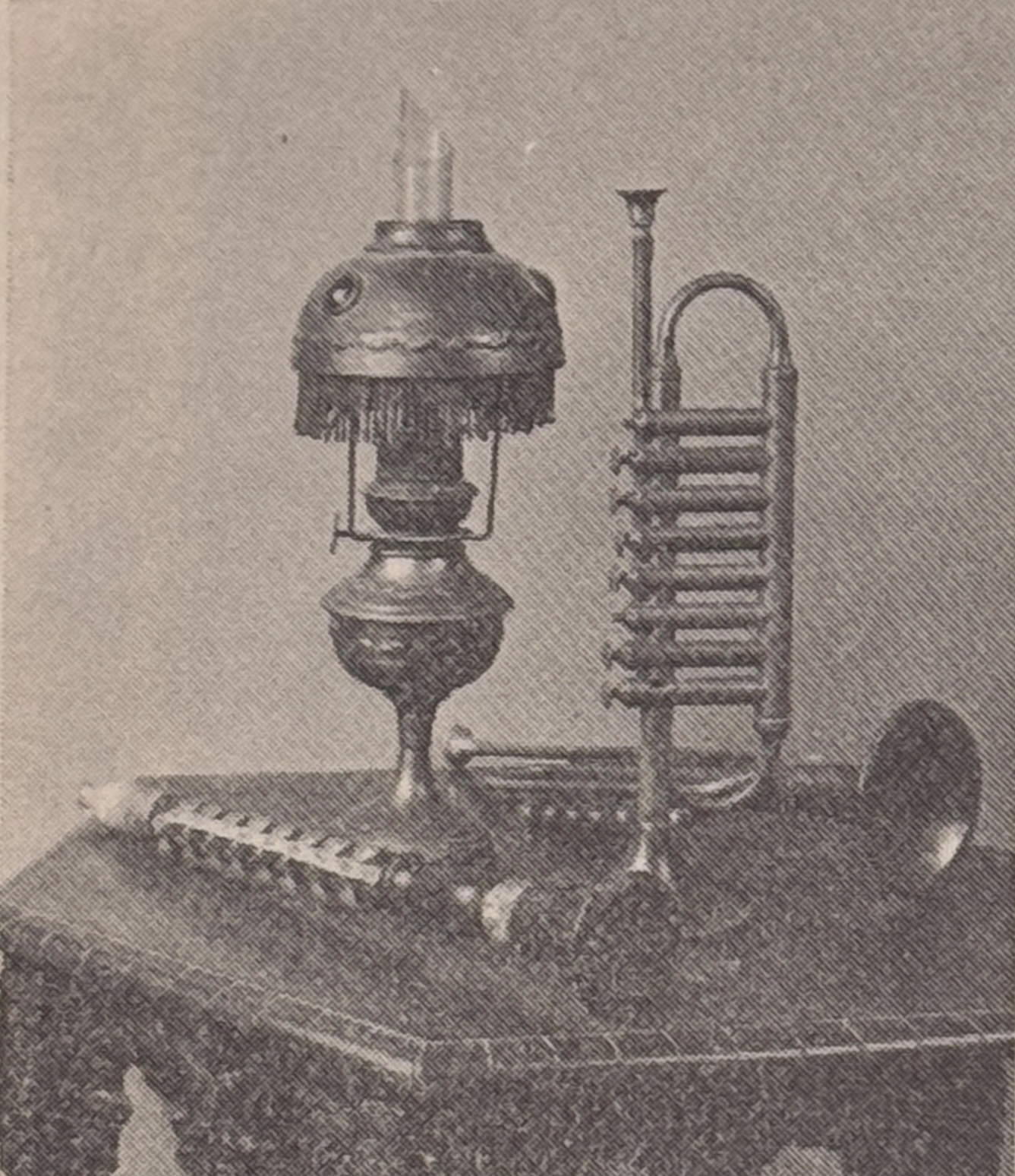 ちょっと不思議なのが、吹く時に指で押さえるピストンが4つついていること。現在演奏の際に使われている普通のラッパ=トランペットのピストンは3つです。うーん、画家はその辺りけっこういい加減に描いたのかとも思い、調べてみると、まれに4つピストンがある楽器もあることがわかりました。