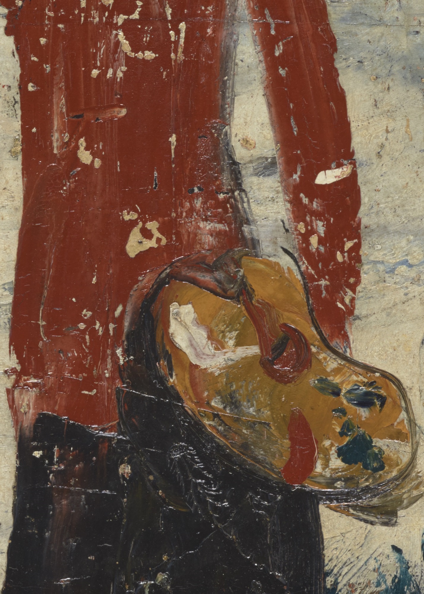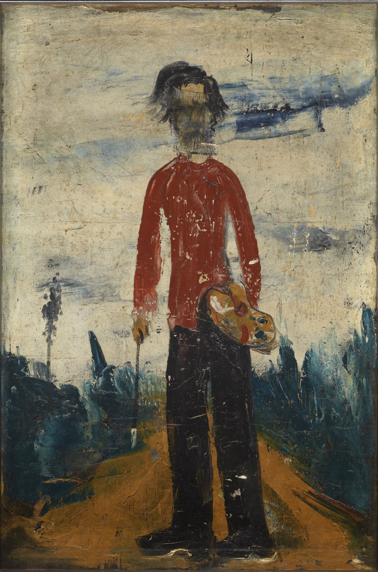 自画像の代表作。写実的な描写から脱したのちに確立した速記的な画風によるもので、塗り直しがなく、塗り残しも気にしていない、まるでひと筆で描いたかのよう。背景には遠近をつけているが、人物は紙人形を思わせる平面的なシルエット。正面を向いて立つ姿勢は画家としての自負をうかがわせる一方で、顔面は描いたあとにパレットナイフで削り取られ、その表情はうかがえない。不思議な魅力をたたえた作品。