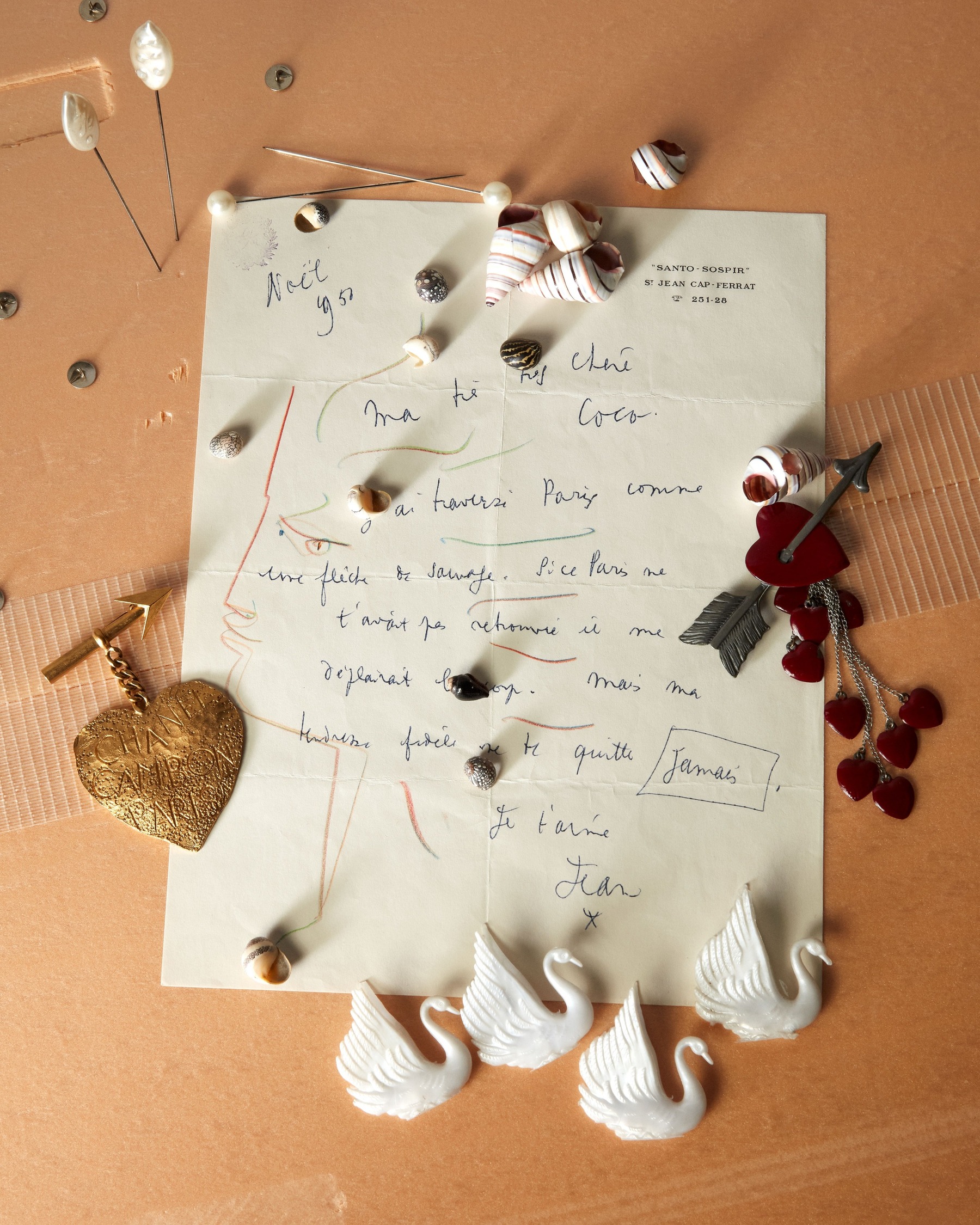 また、平面のドローイングやレターに、ある小物をリンクさせて、観る者の想像力を刺激する作品も。ジャン・コクトーがシャネル宛に送った手紙には、ハートモチーフのブローチに加えて、ジャン・コクトーが詩に詠んだことでも知られる貝殻がさりげなくあしらわれています。