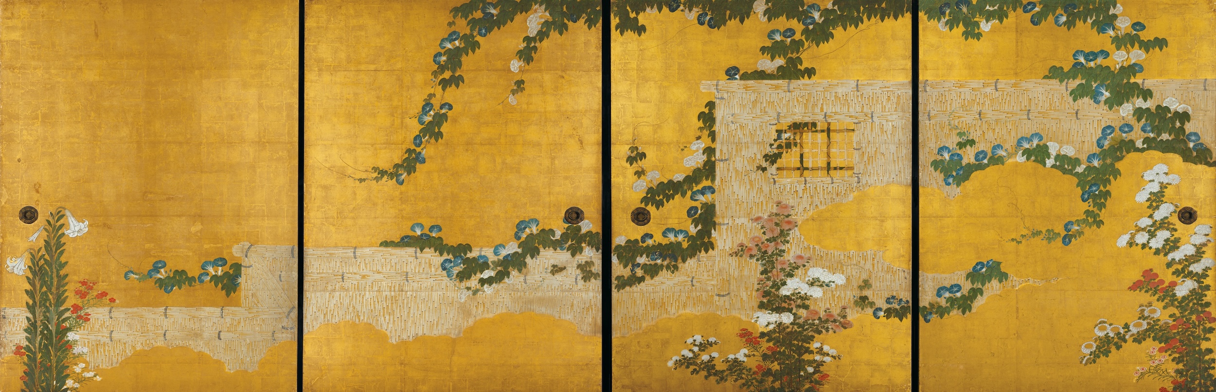 江戸時代後期は園芸が盛んだったことが近年多く検証されているが、『籬に朝顔図襖』は江戸時代初期の作品だ。描かれたのは1631年。豊臣家が滅びた「大坂夏の陣」から、まだ十数年しか経っていない。徳川家が幕藩体制を整えるのに躍起となっていたこの時期に、京都では花を愛でる貴族たちの文化が残り、また発展していたということにもなろうか。実に感慨深い。