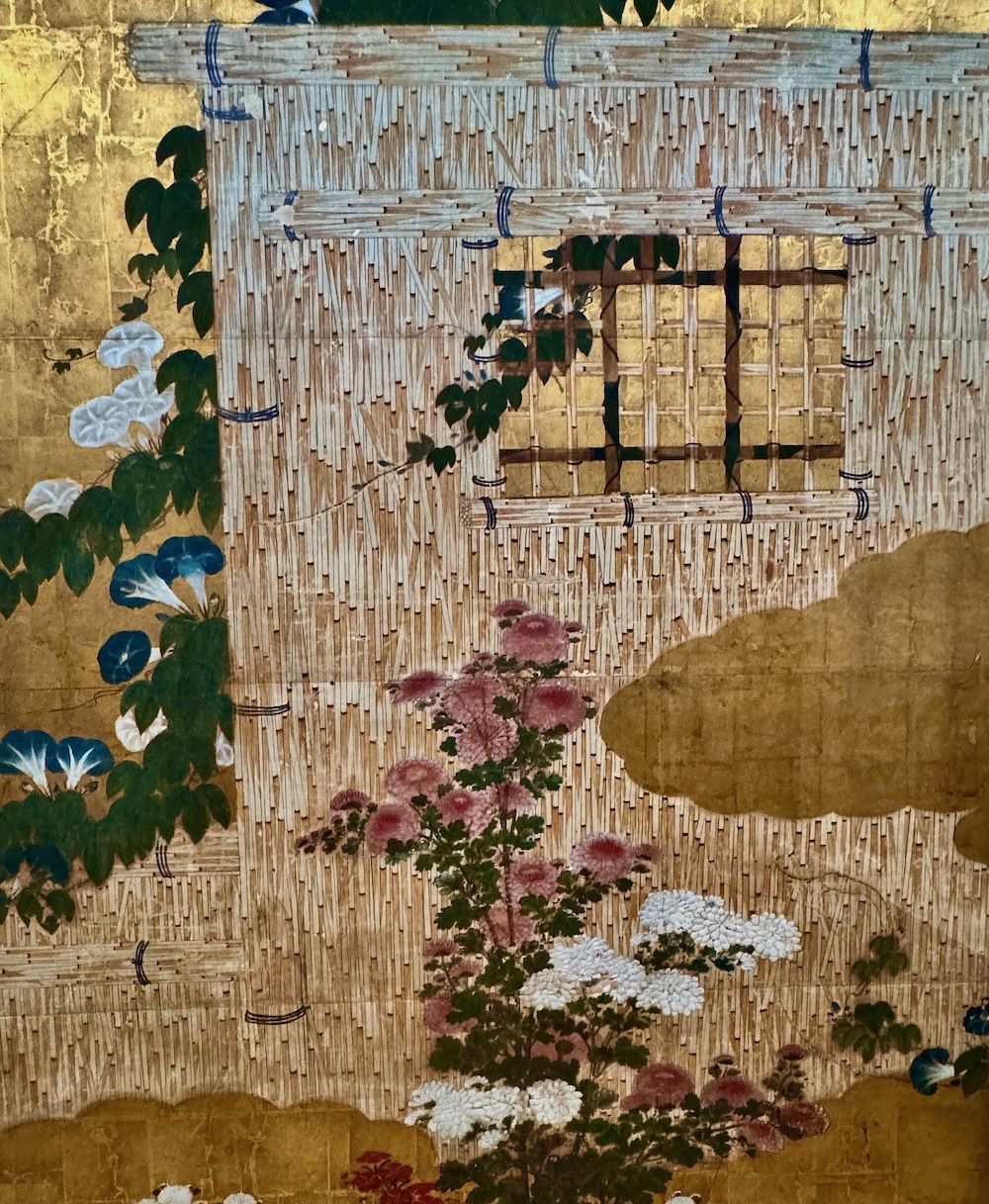 さらに注目すべきは、籬に蔓で絡む朝顔である。金箔張りで絢爛豪華。装飾性の高い画面の中で、朝顔の花や葉は意外とリアルに描かれている。こうして、籬だけでも、朝顔だけでも表現しえない美の世界を、山雪は創り上げているのである。