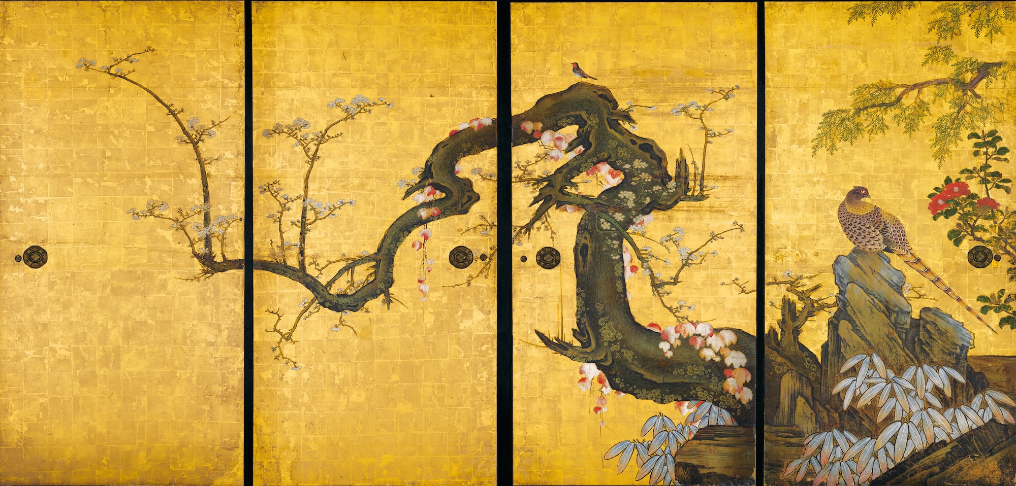 山雪は、形で遊ぶのが大好きな画家だ。本展に出品されている同じ天球院所蔵の『梅花遊禽図襖(ばいかゆうきんずふすま) 』は、梅の木のくねり方が実に魅力的である。梅の木には現代の実物を見ても奇矯(ききょう) な形を見せている例があるが、はたしてこの梅の木は実物を写生したものなのだろうか? 襖というサイズと縦横比が決まった媒体の中で、山雪は思いっきり遊んでいるのではなかろうか。