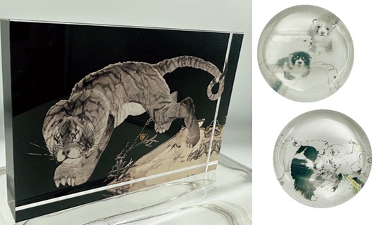 府中市美術館「長沢蘆雪」展オリジナルグッズより、左/「虎図アクリルブロック」4,180円。右/「蘆雪と応挙 師弟箸置きセット」1,100円。上が芦雪の師・円山応挙が描いた子犬、下が芦雪が描いた子犬。