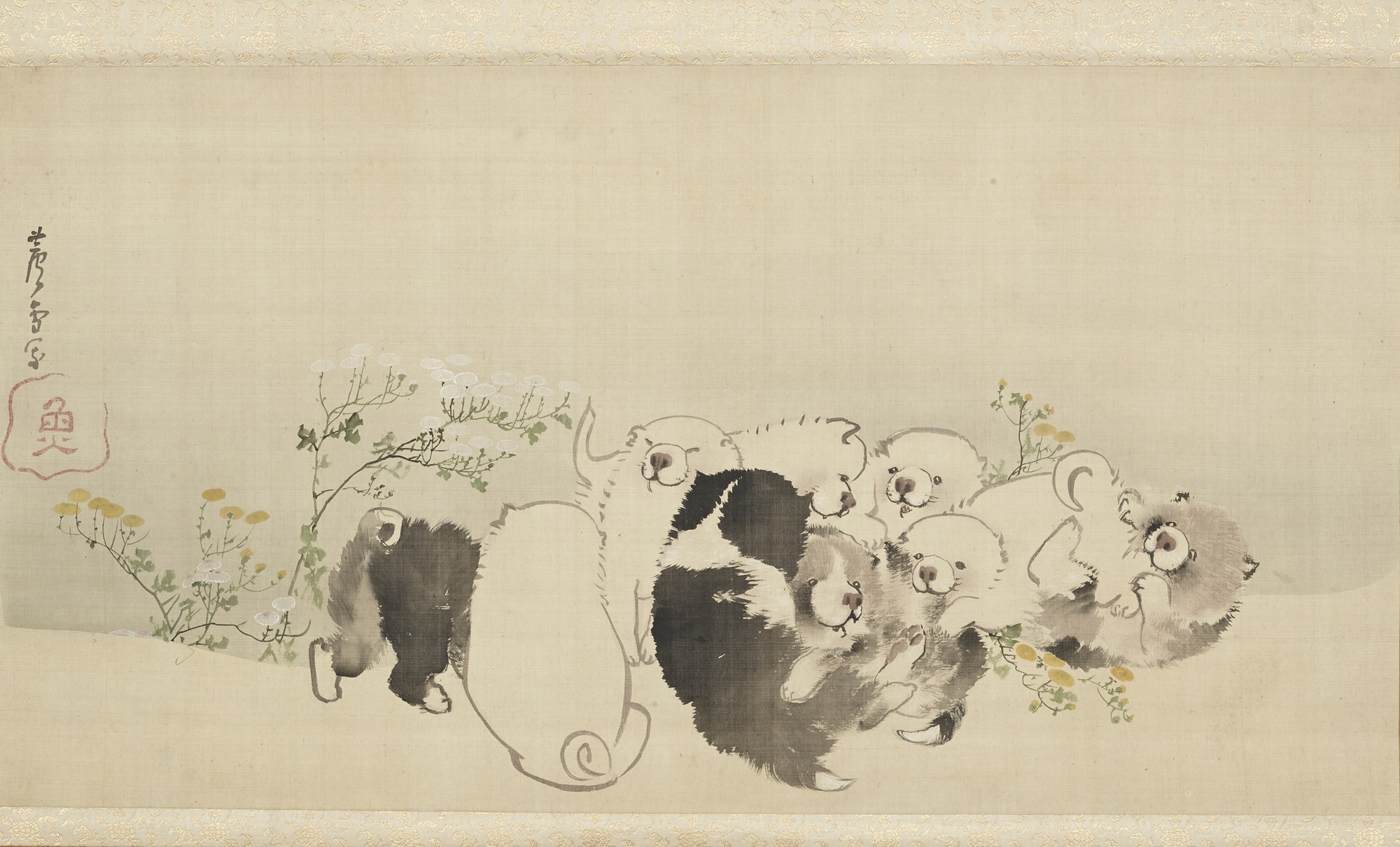 長沢芦雪 『菊花子犬図』 江戸時代(18世紀) 1幅 絹本着色 個人蔵