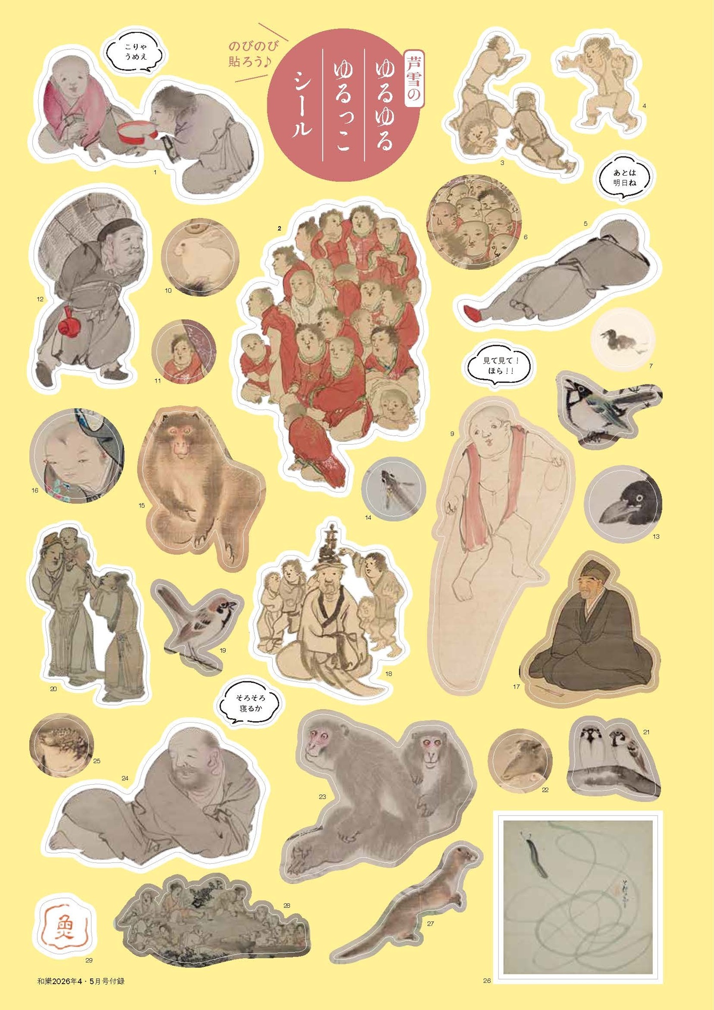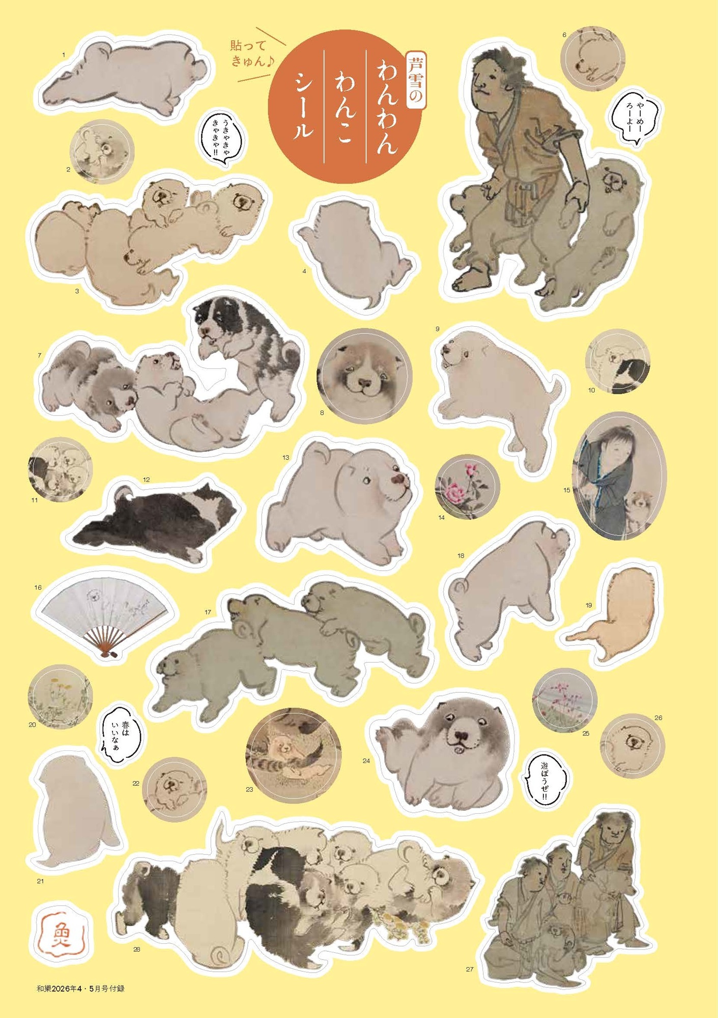 『和樂』2026年4・5月号の特別付録は、長沢芦雪の作品から超絶かわいい子犬と、超絶なごむ人物や動物などをピックアップしてシールにしました。編集部渾身の自信作、トップオブトップのかわいらしさは、スマホや手帳などに貼れば目に入るたび思わず頰がゆるんでしまうはず!