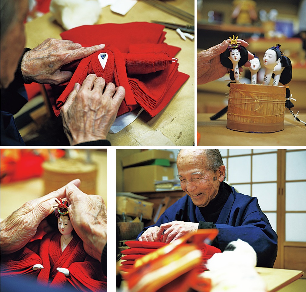 京人形はすべて手作業の分業制。頭師、織物師、小道具師、手足師、髪付師(かみつけし)、着付師と6部門あり、3代目安藤桂甫(あんどうけいほ)さんはその総仕上げとなる着付師として、着姿を整え、人形に命を吹き込んでいく。