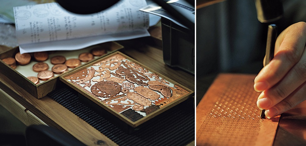 主な素材は銅板や真鍮(しんちゅう)板。鏨(たがね)と金槌を使って「彫る」「切る」「たたく」「曲げる」といった技法により形を整えていく。最後にメッキを施して、独特の輝きと耐久性をもたせる。長年の経験と熟練の技が光る。