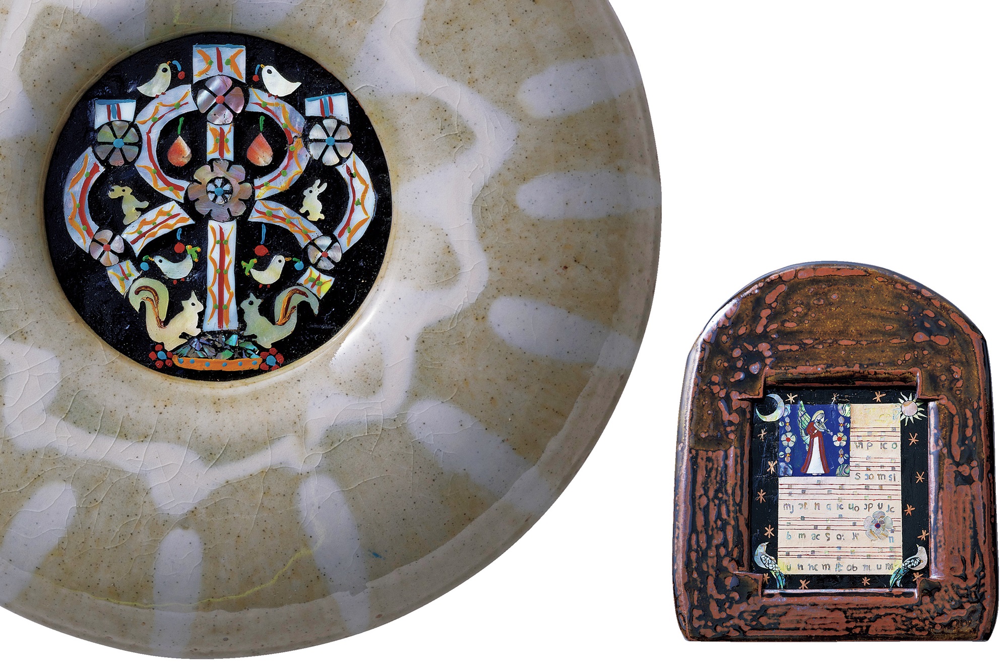 左/『Tree of life』121,000円(縦21.1cm×横21.1cm×厚さ3.2cm)京都での取り扱いは「MISENOMA」のみ。右/『ネウマ譜』165,000円(縦30cm×横25cm×厚さ2cm)。※螺鈿陶額の作品詳細、展示会情報等はインスタグラム@pottery_motherofpearlをチェック。