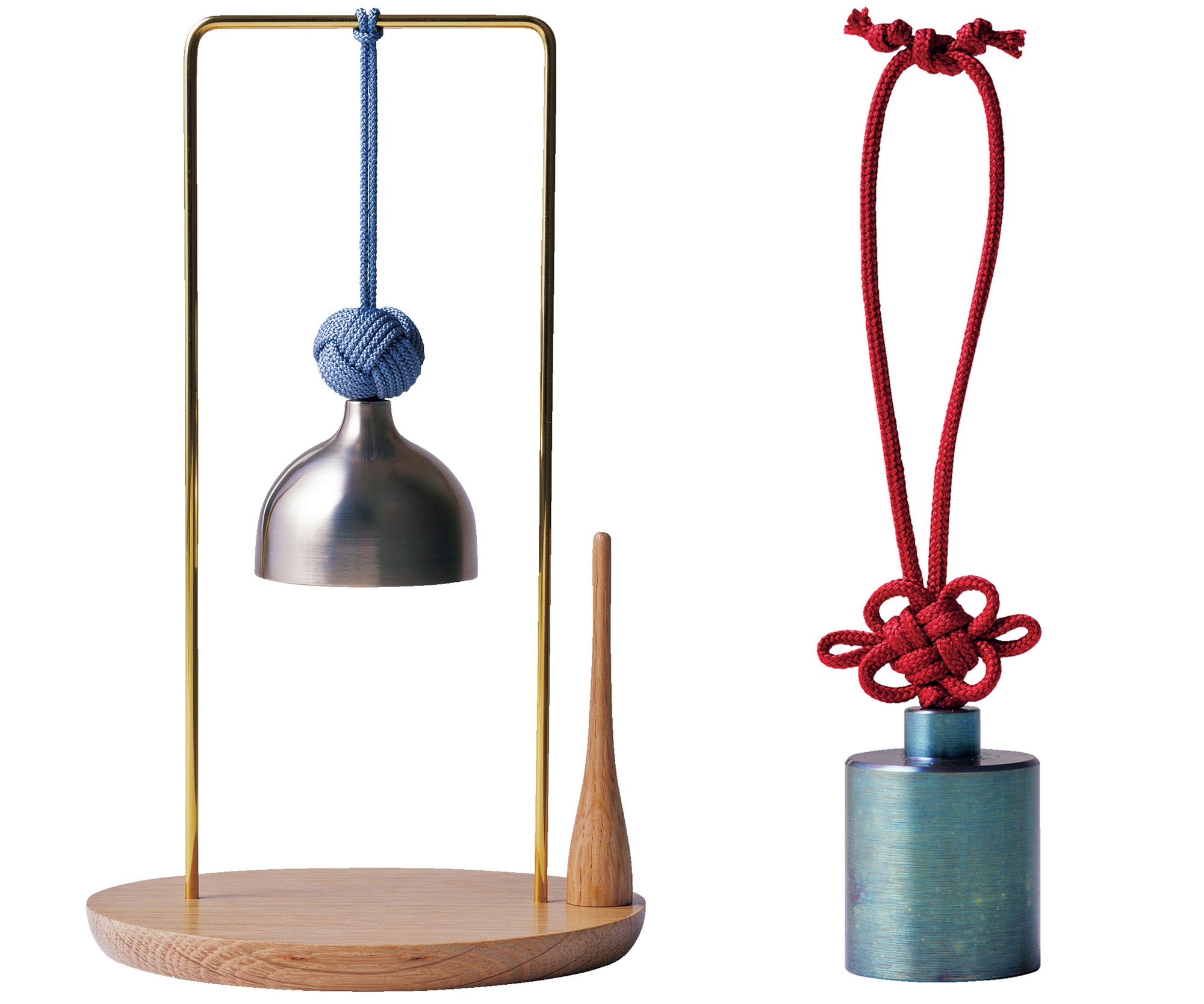 左/付属の棒で優しく叩く「LinNe Myo」38,500円。右/軽く振ってベルのように響かせる「Chibi(M)菊結び」17,600円。共に宇治「昇苑(しょうえん)くみひも」の組紐を使用。