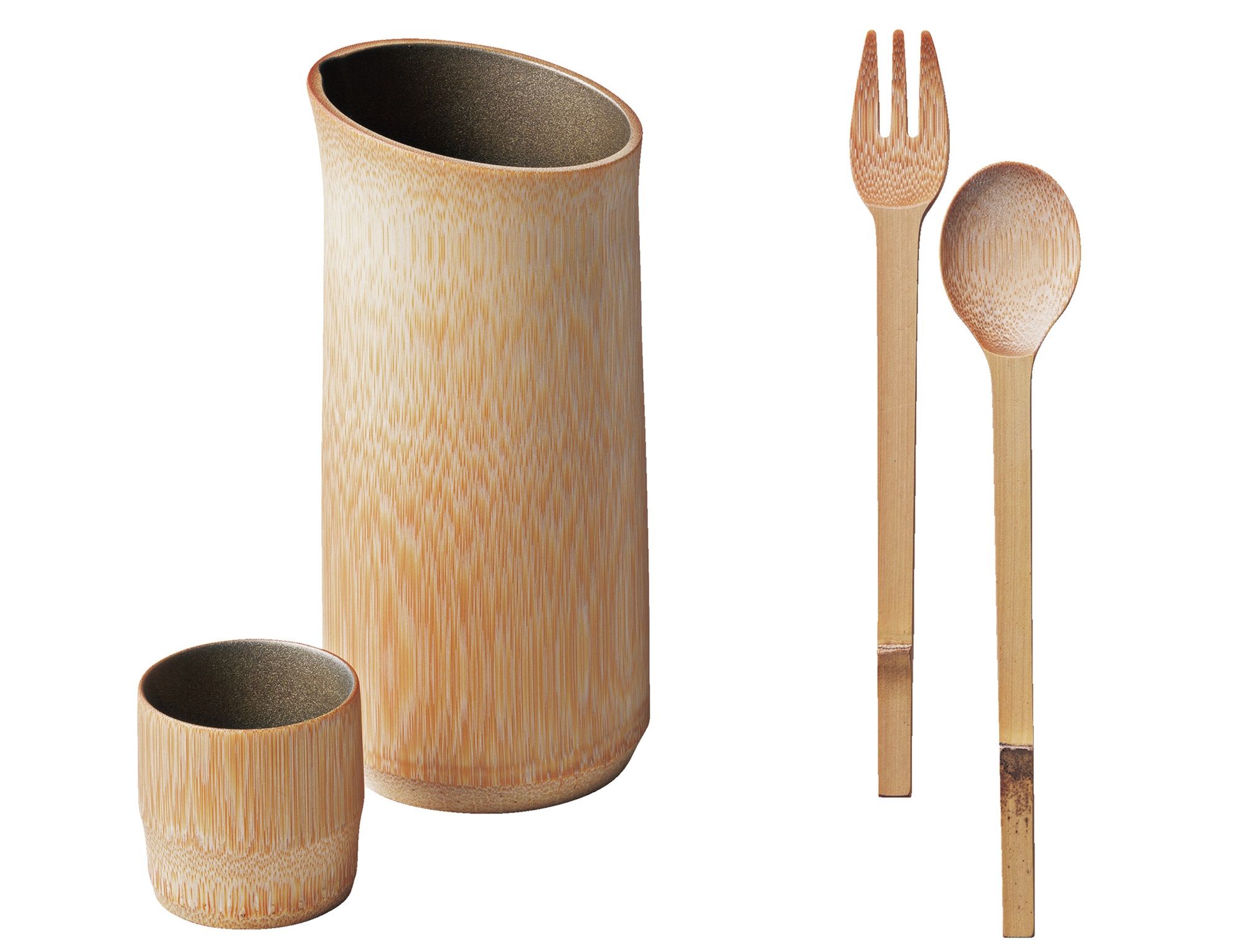 左/肉厚で真円に近い竹を厳選しろくろで挽いた、内側が錫蒔地の、薄く軽やかな徳利とお猪口2個がセットに。「酒器セット」42,900円。右/「カトラリー(皮あり)」各2,910円。