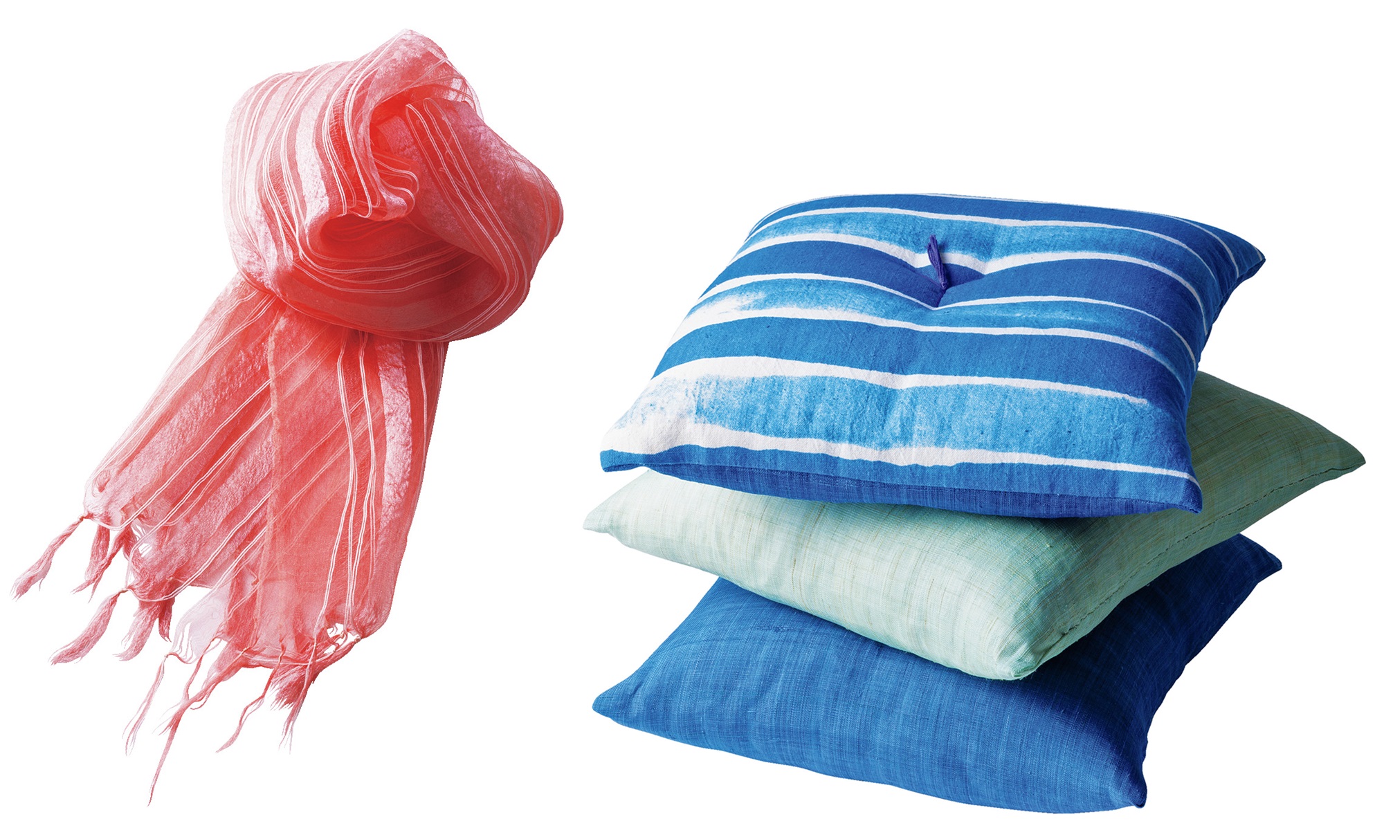 左/優しい風合いのピンクの縦縞ストール19,800円。右/ふかふかの綿入り、木綿の柄入り小座布団19,800円、麻の小座布団各14,300円。