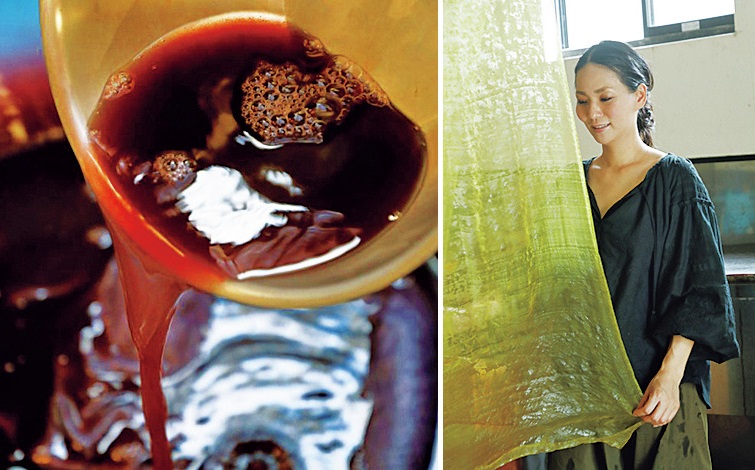 染めに使う生地は、シルク、木綿、麻、和紙などの天然素材。材料となる植物を、沸かした湯の中で煎じて色を汲み出し、納得できる色調になるまで何度も繰り返す。