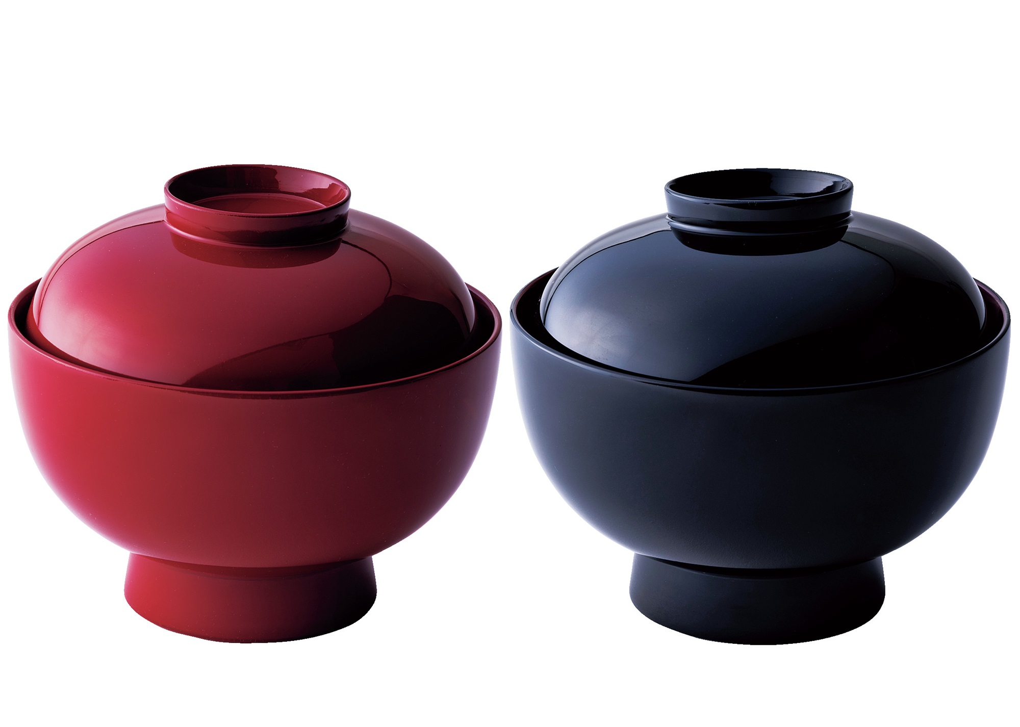 漆の艶やかさが際立つ「雑煮椀(ぞうにわん)」。全体が朱色の「総朱(そうしゅ)」塗りと、外側を黒、内側を朱で塗り分けた「黒内朱(くろうちしゅ)」塗りの2色展開。各39,600円。