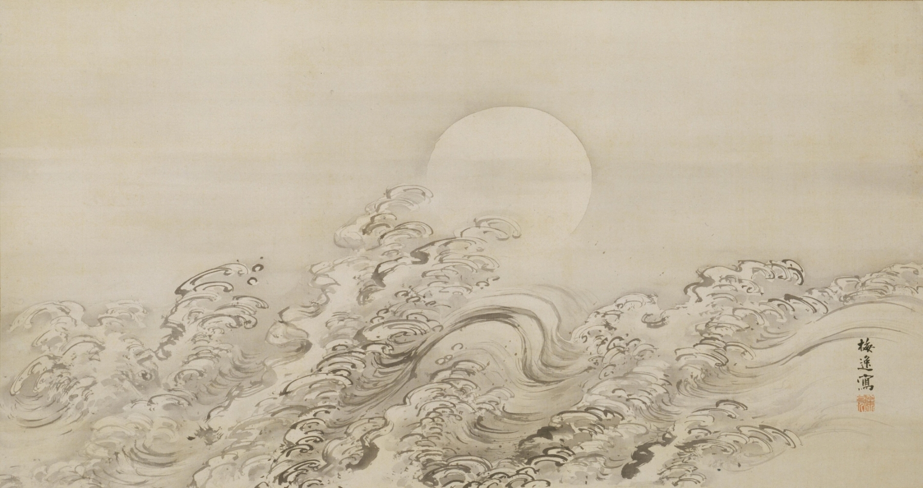 流れるような筆致で激しく描かれ、ひときわ高く打ち上がる波は、まるで満月を支えているかのようだ。横長の画面が水面の広がりを感じさせる。