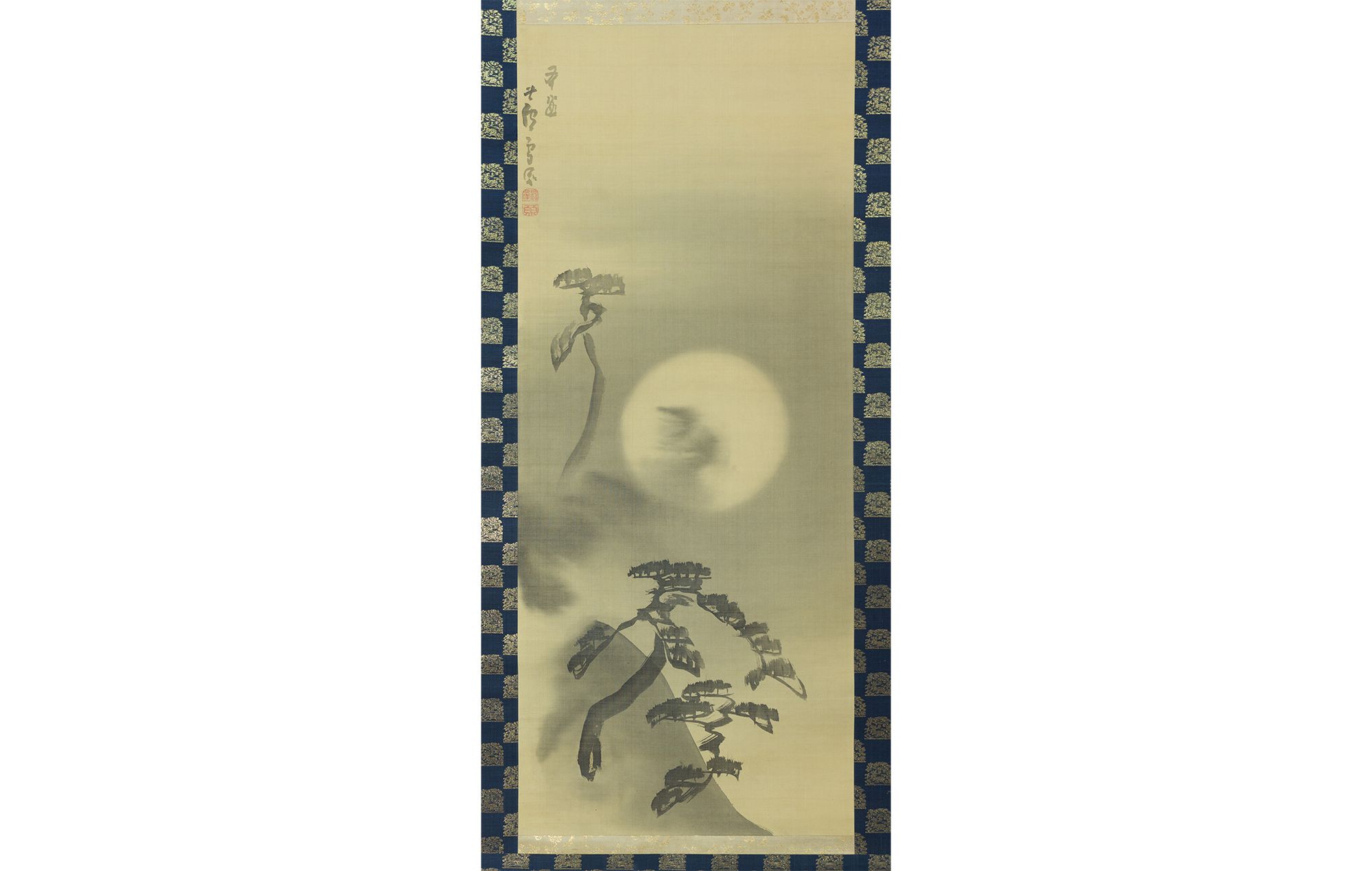 荒波の向こうに、穏やかな満月が浮かぶ。月は、絹地のままに塗り残すことで表現しており、周囲の淡い墨色は雲や霧を思わせる。