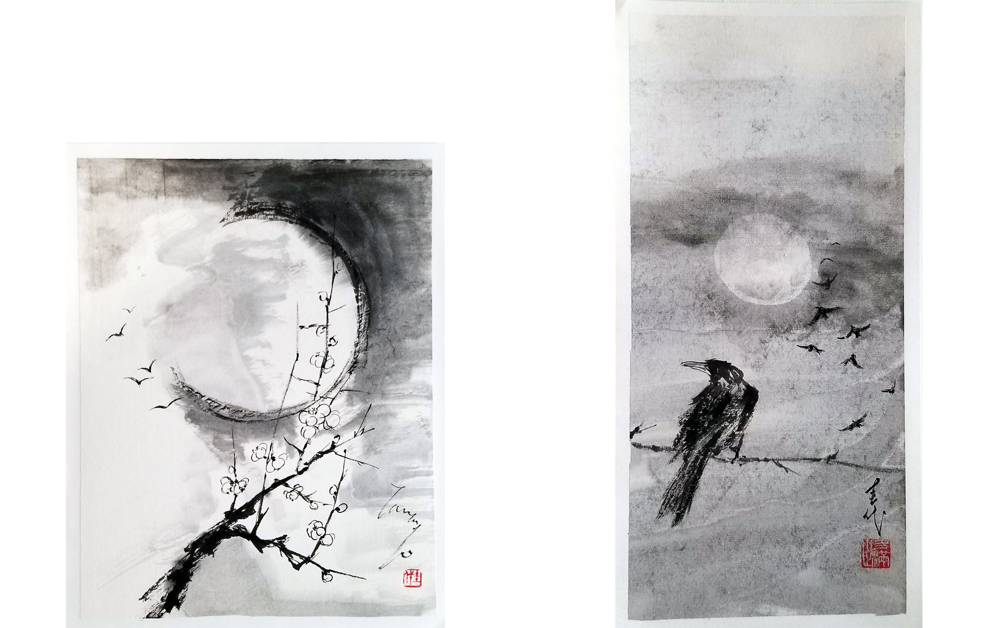 鮫島圭代 《月に梅》 《月に烏》 いずれも紙本墨画 2025年