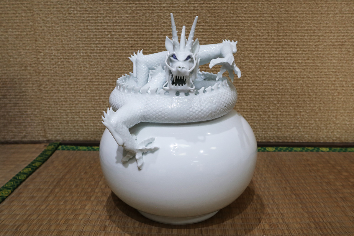 迫力もさることながら、白龍そのものが純白で、深い青い目が非常に美しい。三川内焼の特徴である青い顔料の「呉須(ごす)」だ。