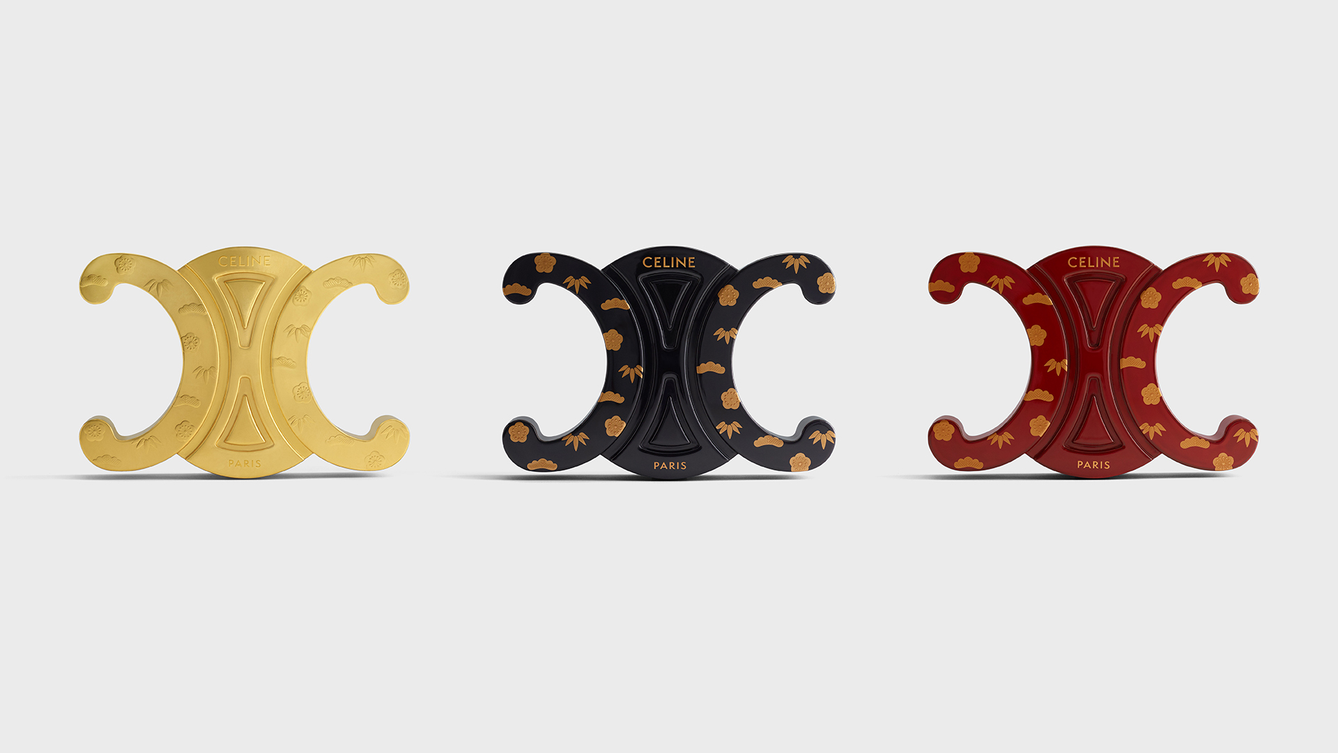 今回の展示では、日本の伝統美とセリーヌのエンブレム「トリオンフ」が出会い、文化的な対話を生み出します。トリオンフとは、創業者セリーヌ・ヴィピアナが1971年、パリの凱旋門を囲むチェーン装飾にインスピレーションを受け生まれた象徴的モチーフ。これを漆芸で再解釈したアートピースが、石川県輪島市を拠点とするアーティスト集団「彦十蒔絵」によって特別制作されました。