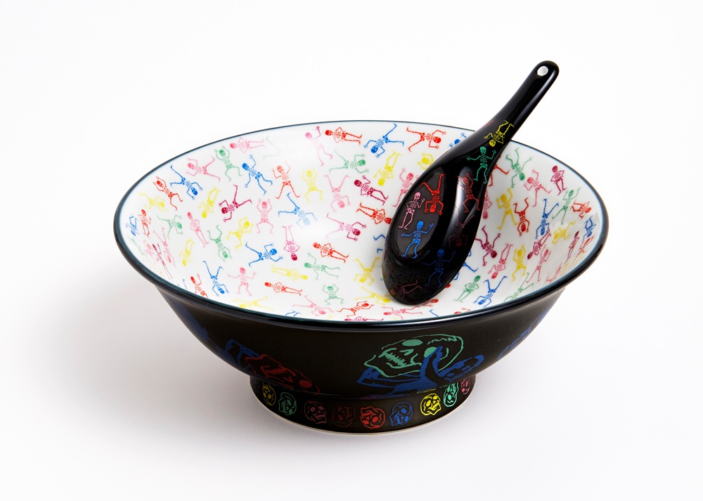 外側の黒と丼内のカラフルでポップなイラストのコントラストがおしゃれな丼。しかし、よく見ると、そのイラストは骸骨なのである。横尾忠則氏がデザインしたラーメン丼は、豚骨ラーメンにひっかけたもの。さすが巨匠、可愛いだけじゃない、食べれば食べるほど、たくさんの骸骨と出あえる丼となっている。展示コメントには「とんこつラーメンを食べてしっかりした骨をつくりましょう。」と、ユーモア全開だ。