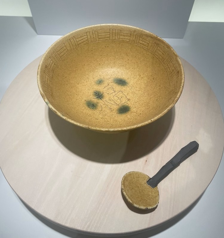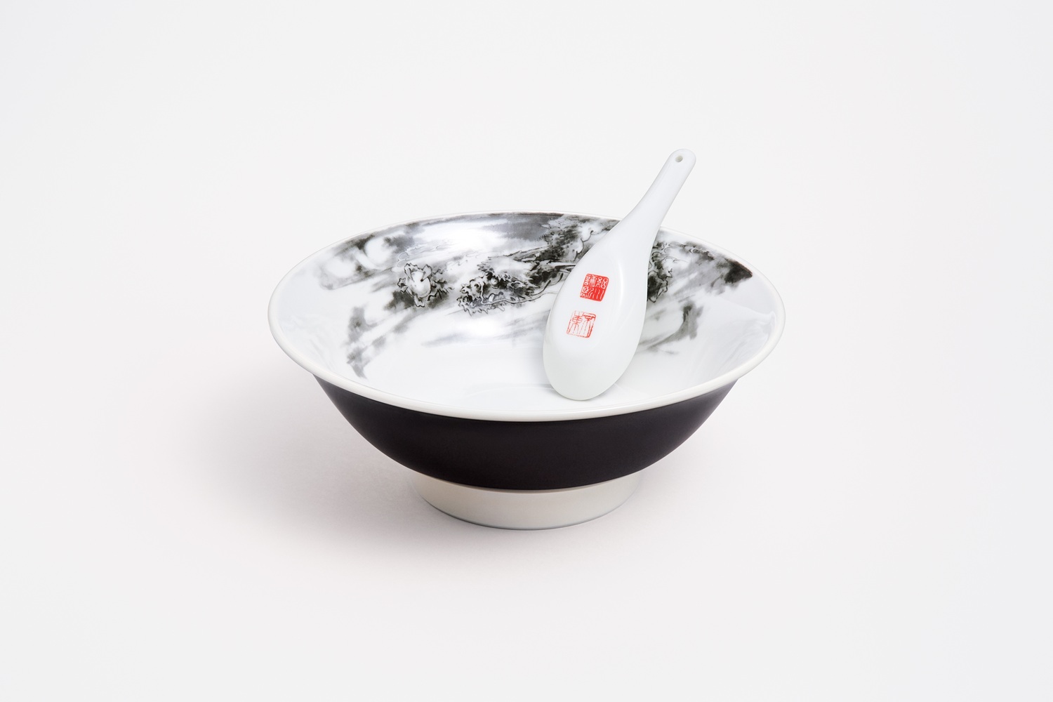 続いては「渋い!」の一言が思わず口をついて出てしまったが、こちらはなんと、元総理大臣であり、現在は陶芸家・茶人でもある細川護熙氏の丼。ラーメン丼の定番である龍を描いているのだが、この元絵となっているのは、3年前に龍安寺の襖絵を描いた時に考案した何十枚もの習作の中から選ばれた玉龍の絵なのだとか。ラーメン丼の中に日本画が現れると、神妙な面持ちにもなるが、ここにはザ・日本のラーメンといえる醤油ラーメンを入れて食べてみたい。