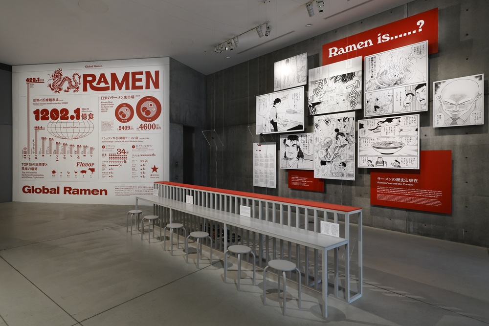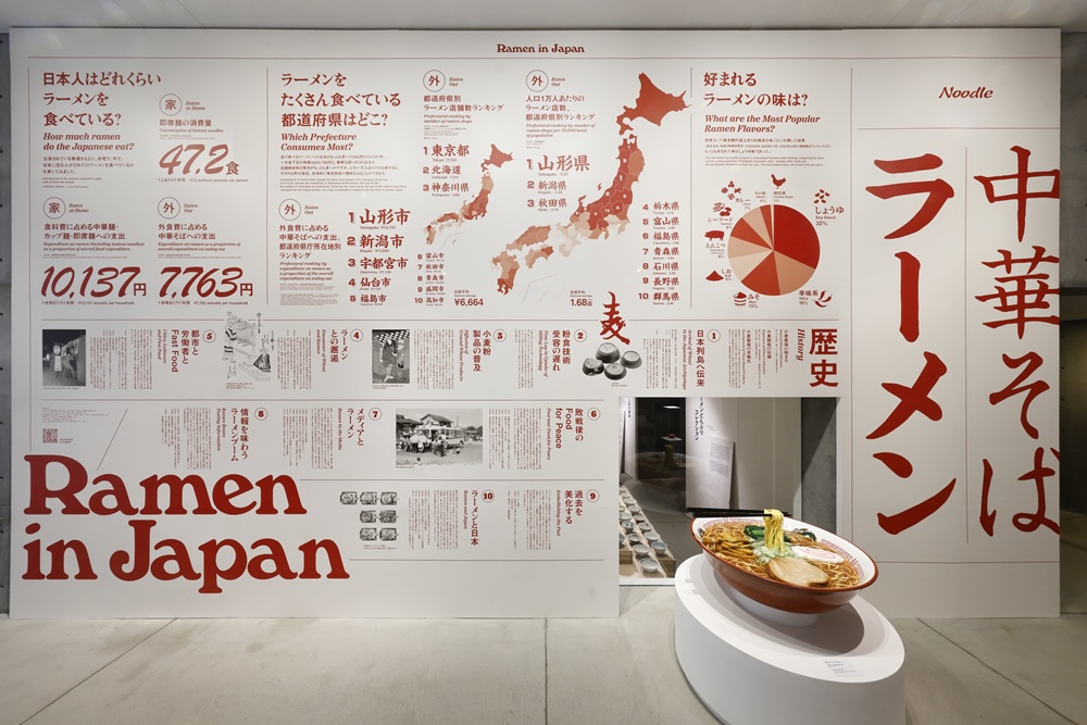 その他、グラフィカルなデザインで、データを表現した世界のラーメン事情や、ミシュランに掲載されているラーメン店の数、都道府県別のラーメン店舗数ランキングなど、意外に知らないデータとラーメンの変遷が展示されている。人口あたりのラーメン店舗数は、東北が上位を占めるなど、新たな発見もある。