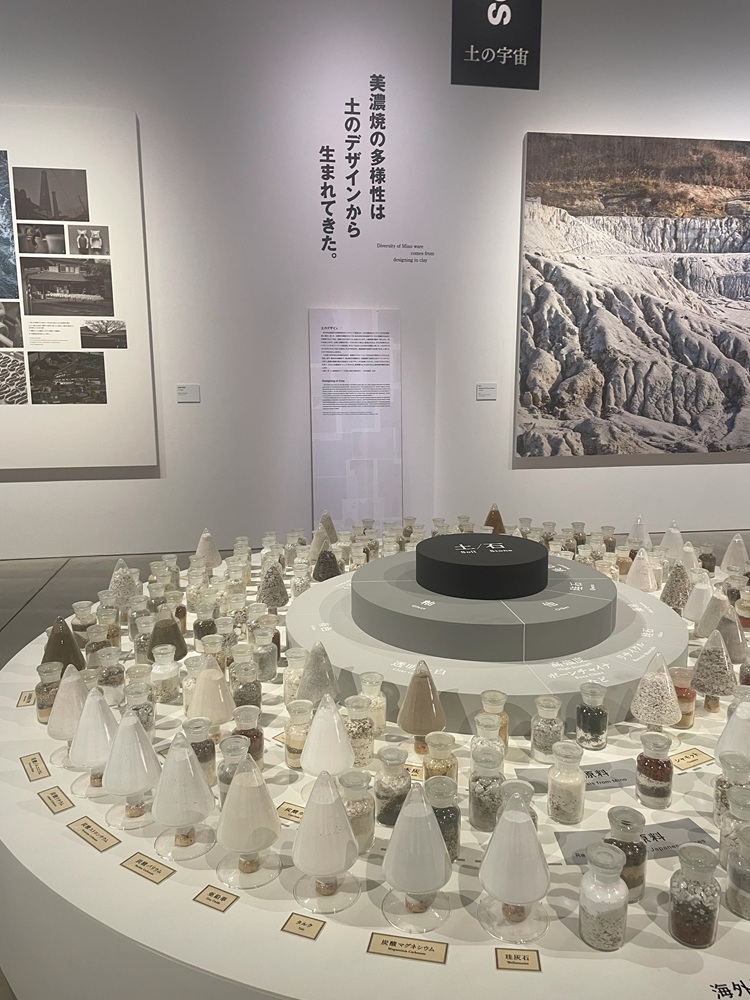 陶磁器を見ることはあっても、その素材まで辿り着くことはなかなかないが、ここでは、土や石の素材から、焼成の過程などを映像で詳しく見ることができる。MINO COSMOSは、土や石を配し、釉薬を使う土もあれば、そのまま素焼きするものもあるなど、素材とプロダクトを一覧できるコーナーとなっている。東濃では、土のブレンドも、長年の先人の知恵により受け継がれている。そこから、工業用のセラミック、部品、タイルなどへと発展していったことがわかる。