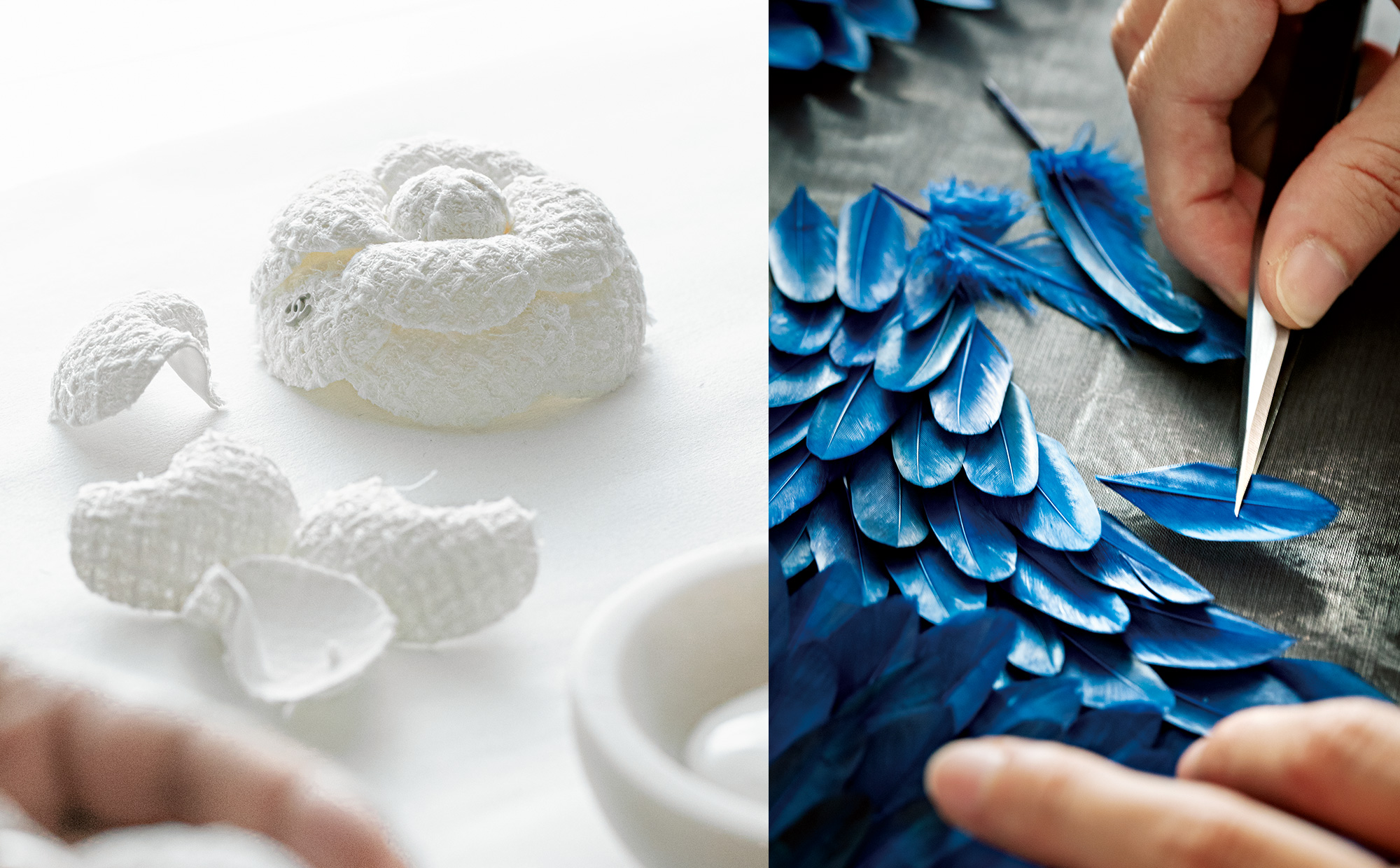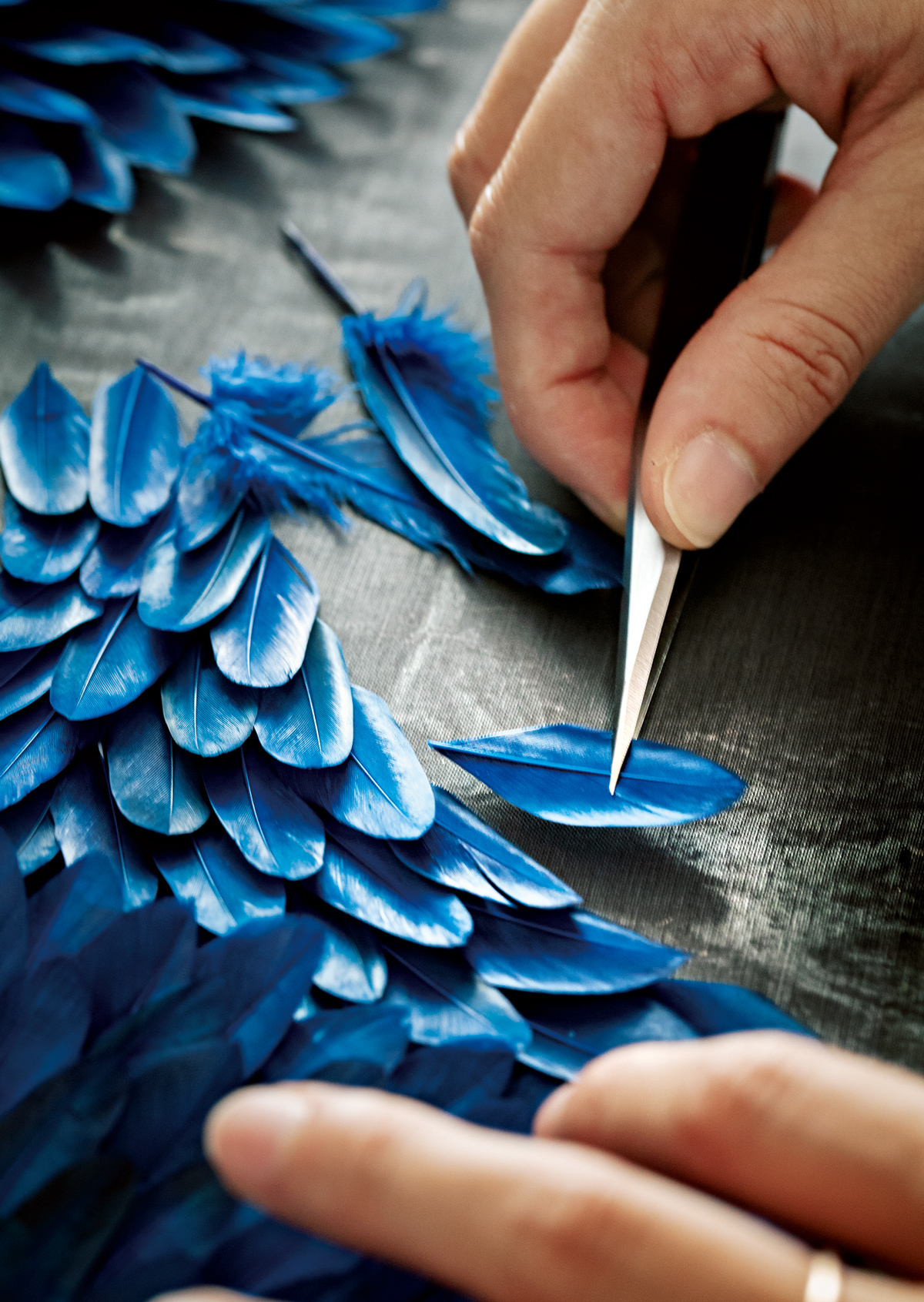 「ルマリエではダチョウ、ガチョウ、雄鶏、カモなどの羽根を主に使用し、それぞれに異なる加工を施します。たとえば、ガチョウの羽根はフリンジ状にしたり、プリントを施したり…。その技法は無限にあり、数種の羽根を組み合わせて、〝新しい鳥〟の羽根を創造することも可能なほど! 職人たちはナイフひとつで羽根の形状を自在に操ることができ、最近では軽やかな布地と羽根を組み合わせることも増えてきました」
