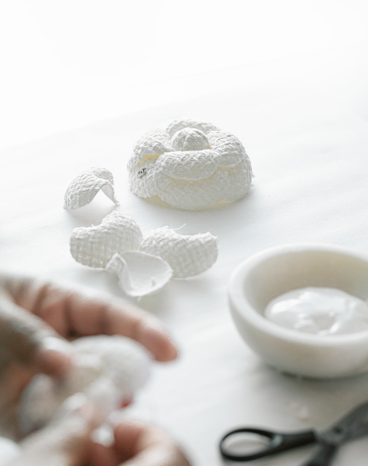 「新作のカメリアを生み出すとき、基本の形の再解釈から始めます。カメリアに独自性をもたらすのは、色、素材、花びらの数、加工の種類といったすべての要素にほかなりません。コレクションごとにつくられるカメリアにはメッセージが込められ、それが映し出されます」と語るコシェールさん。