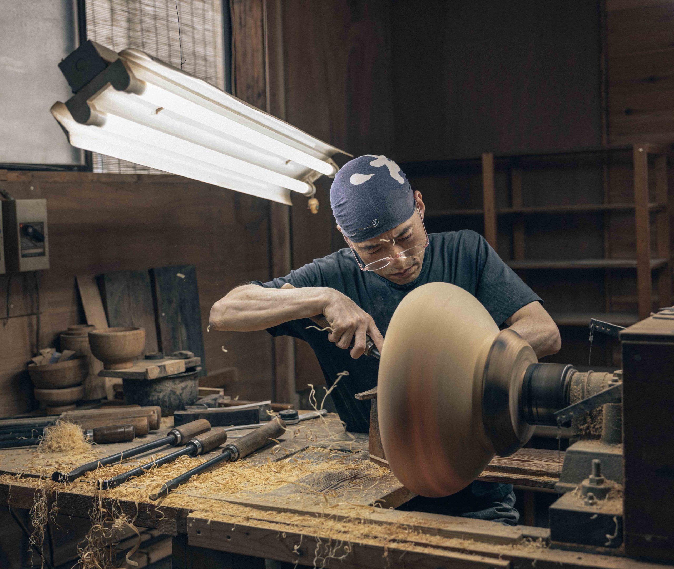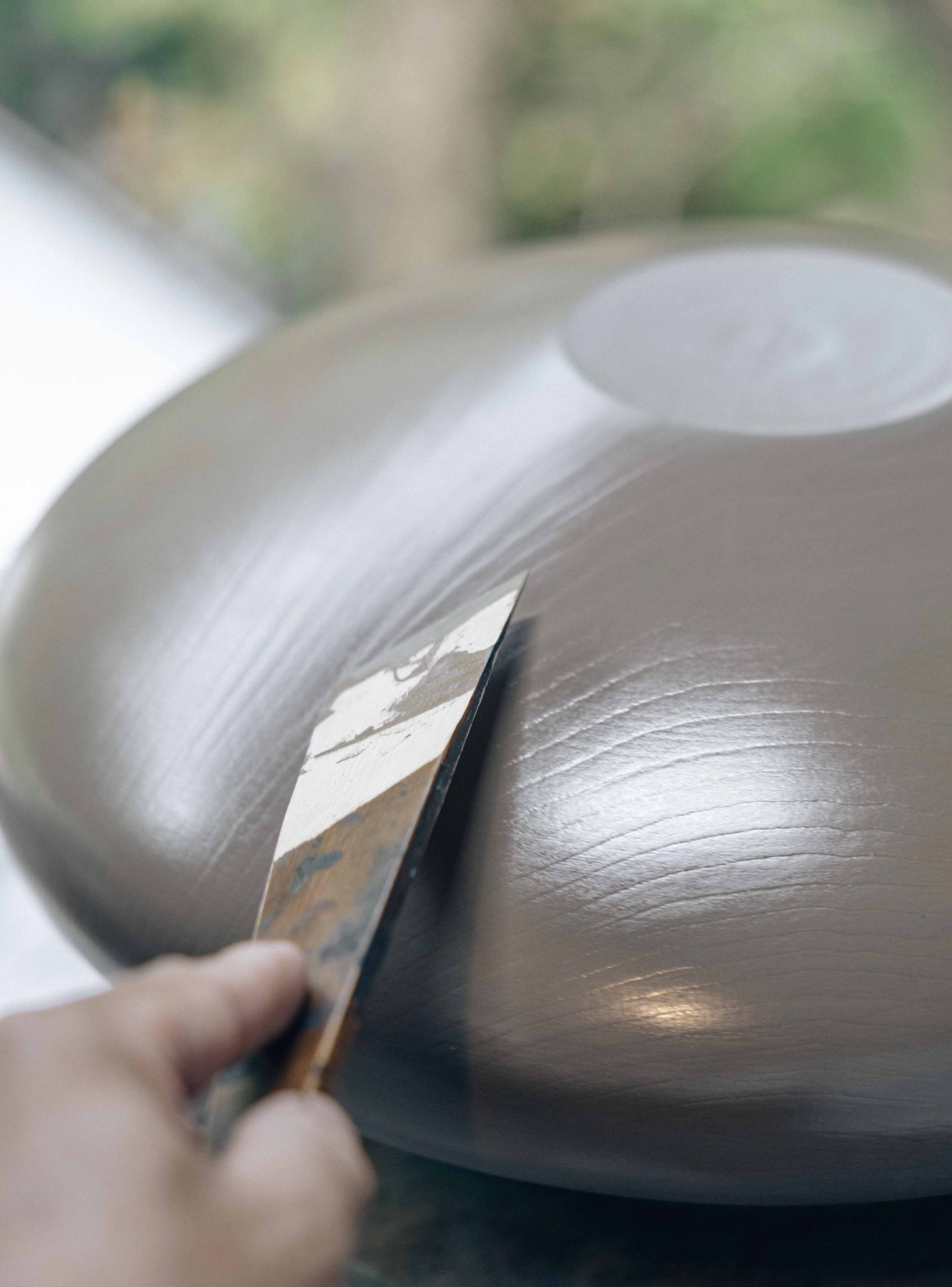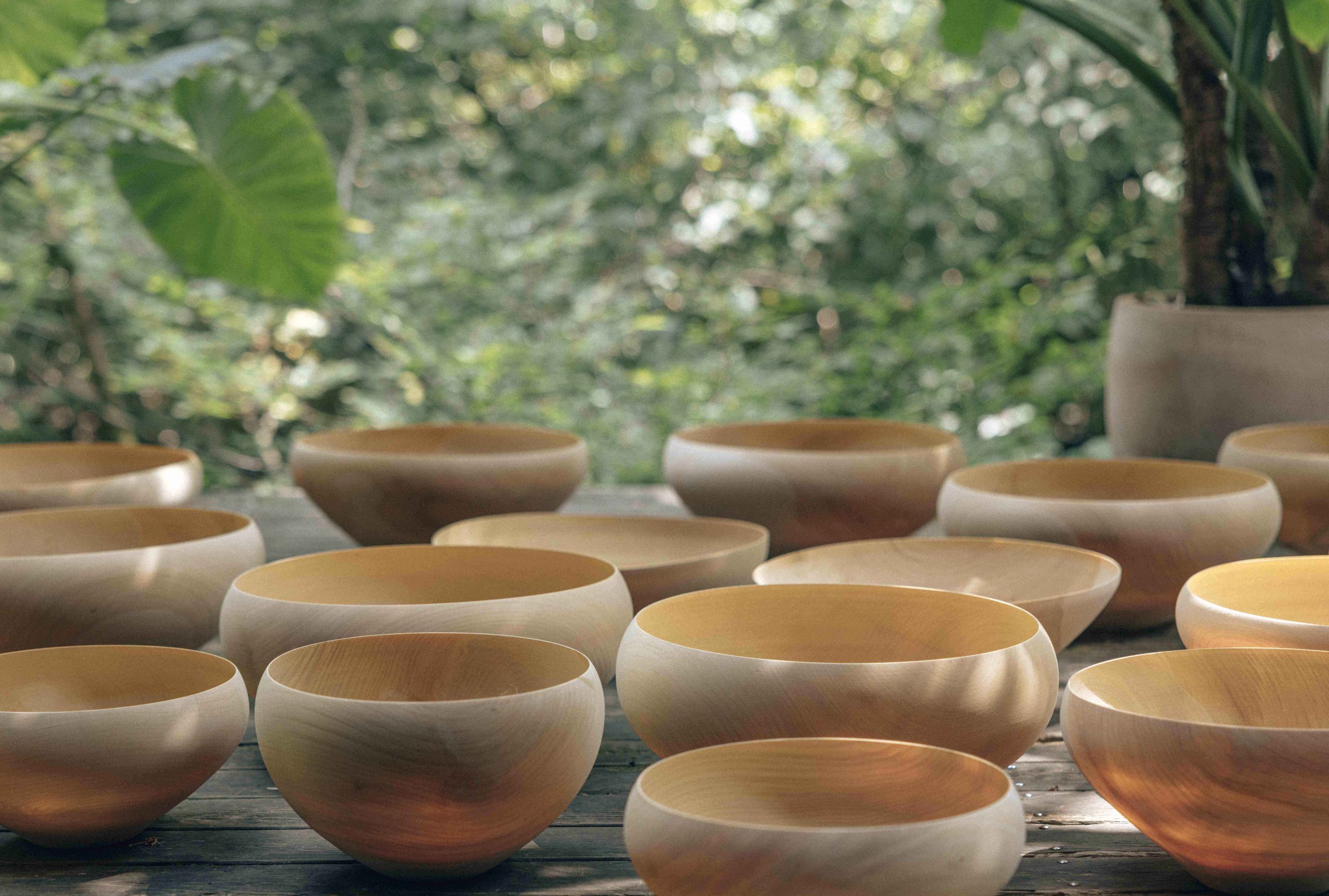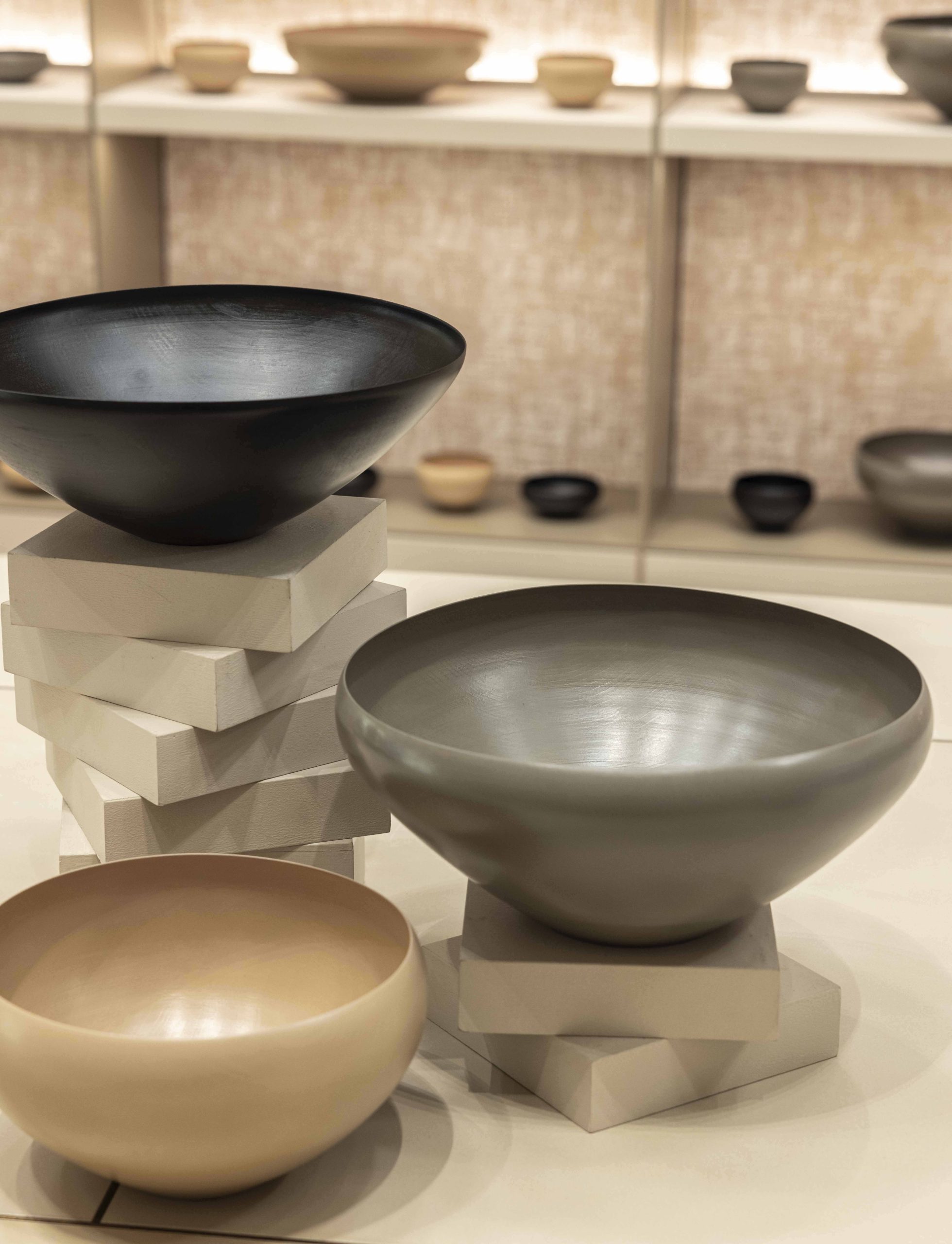 鉢「verticale」は、大きなイチョウの丸太を使用。厚さ約1・2㎜と木地をごく薄く挽いてあり、大きいものは直径40㎝ほどあるにもかかわらず、実際に手にするとかなり軽いことに驚きます。ミニマルな器の中には、輪島の職人たちの手の確かさ、繊細で卓越したクラフツマンシップが息づいているのです。