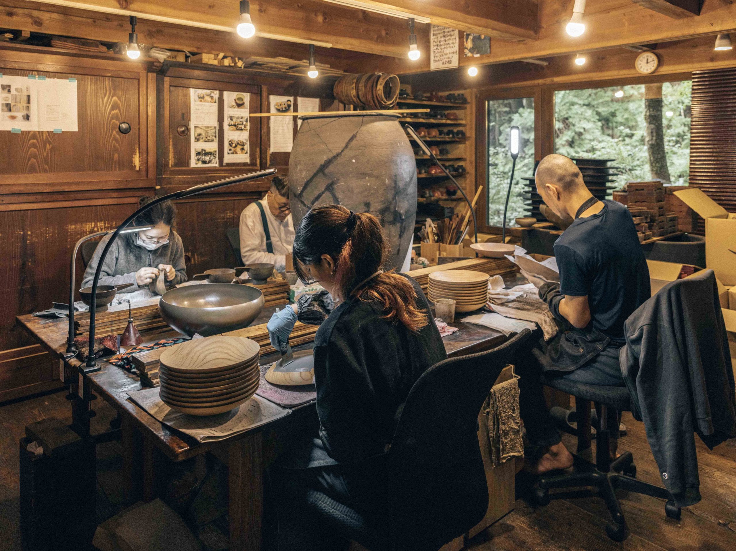 共通項はほかにも。震災後、職人の減少がますます加速している課題を解決するべく、赤木さんは後継者の育成を目的としたプロジェクトを設立。また現在は、輪島の街並みを取り戻す、復興プロジェクトにも取り組んでいるのだそうです。その姿は、かねてから〝ブルネロ クチネリ〟がソロメオ村の再生に尽力してきた、職人学校の開校や古い建造物の再建といった活動と大いに重なる部分が。このエキシビションが行われたのは、もはや運命だったのかもしれません。