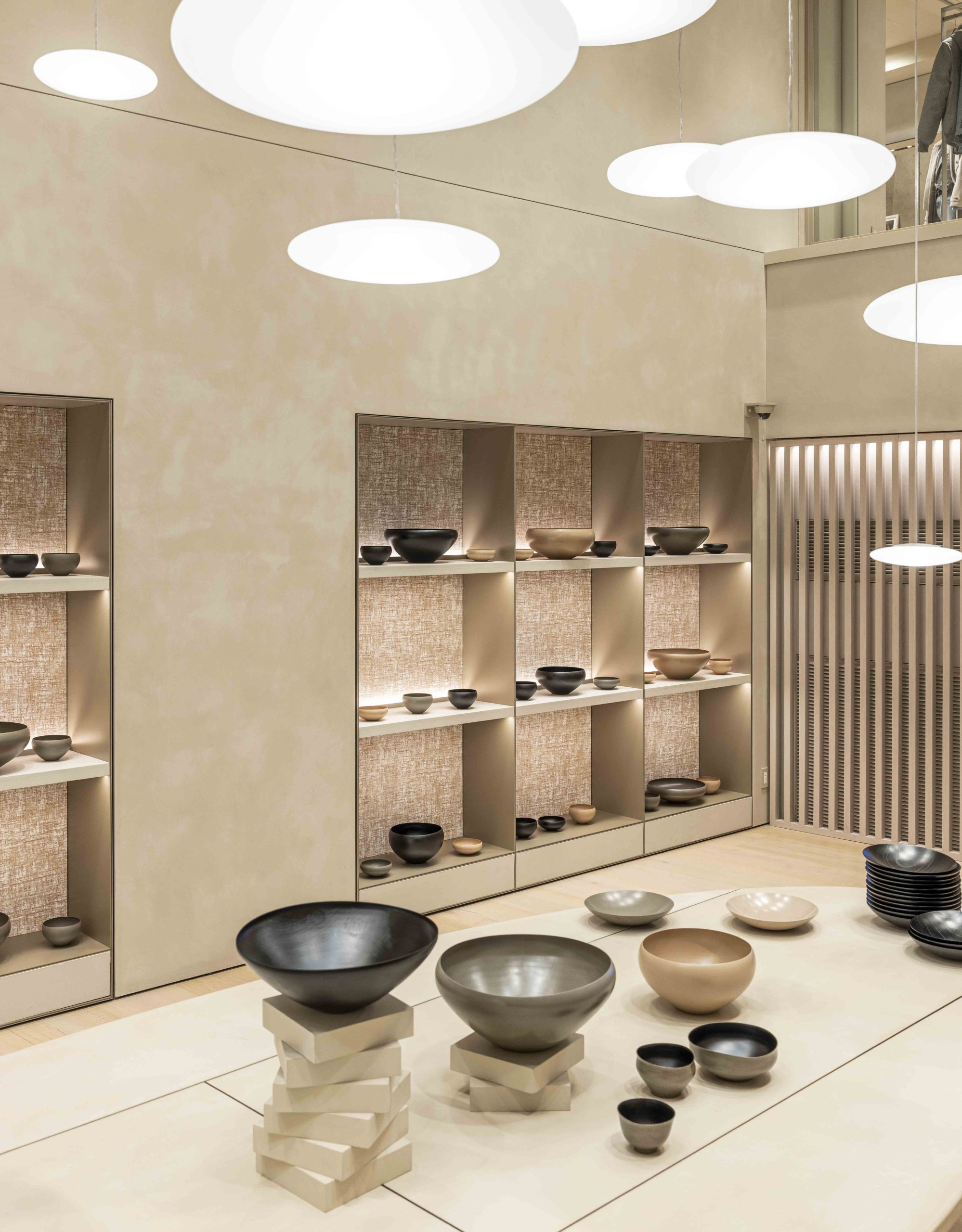 白、グレー、黒の漆を使用するアイディアは、最初に赤木さんがアートスペースを訪ねた瞬間に湧いたそう。特にグレーは初の試みで、微妙な色調を何度も試作。ニュアンスのある優しいトーンが、〝ブルネロ クチネリ〟のムードを彷彿とさせます。