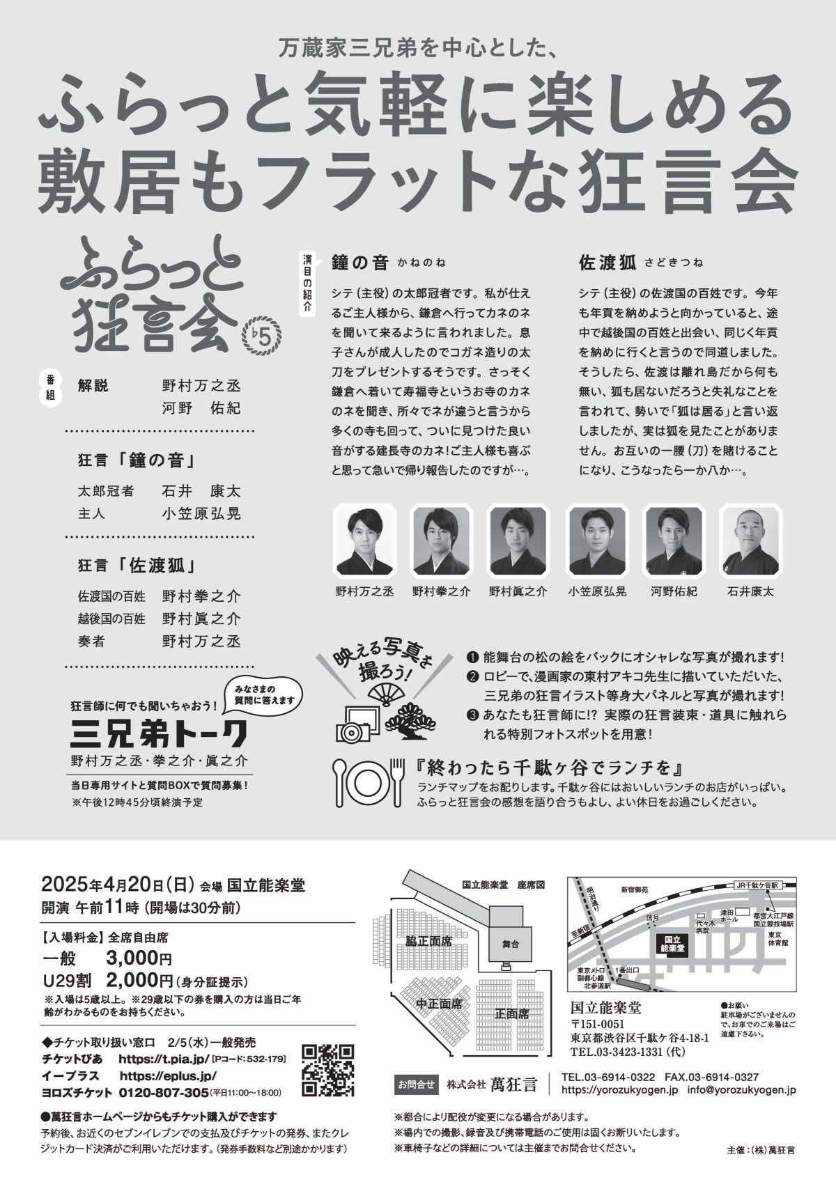 万蔵家三兄弟を中心とした若手がメインとなって企画し、狂言を若い世代の方々にも気軽に楽しんでもらおうと、さまざまな趣向を凝らしています。今回の上演演目は「鐘の音」と「佐渡狐」。「佐渡狐」では万之丞・拳之介・眞之介という三兄弟の競演にご注目ください。演目鑑賞を楽しむほか、能楽堂内に映えるフォトスポットとして、東村アキコ先生の三兄弟イラストパネルや、狂言で使う道具や装束に触れられる特別コーナーもあります。能楽堂内を是非楽しんで!