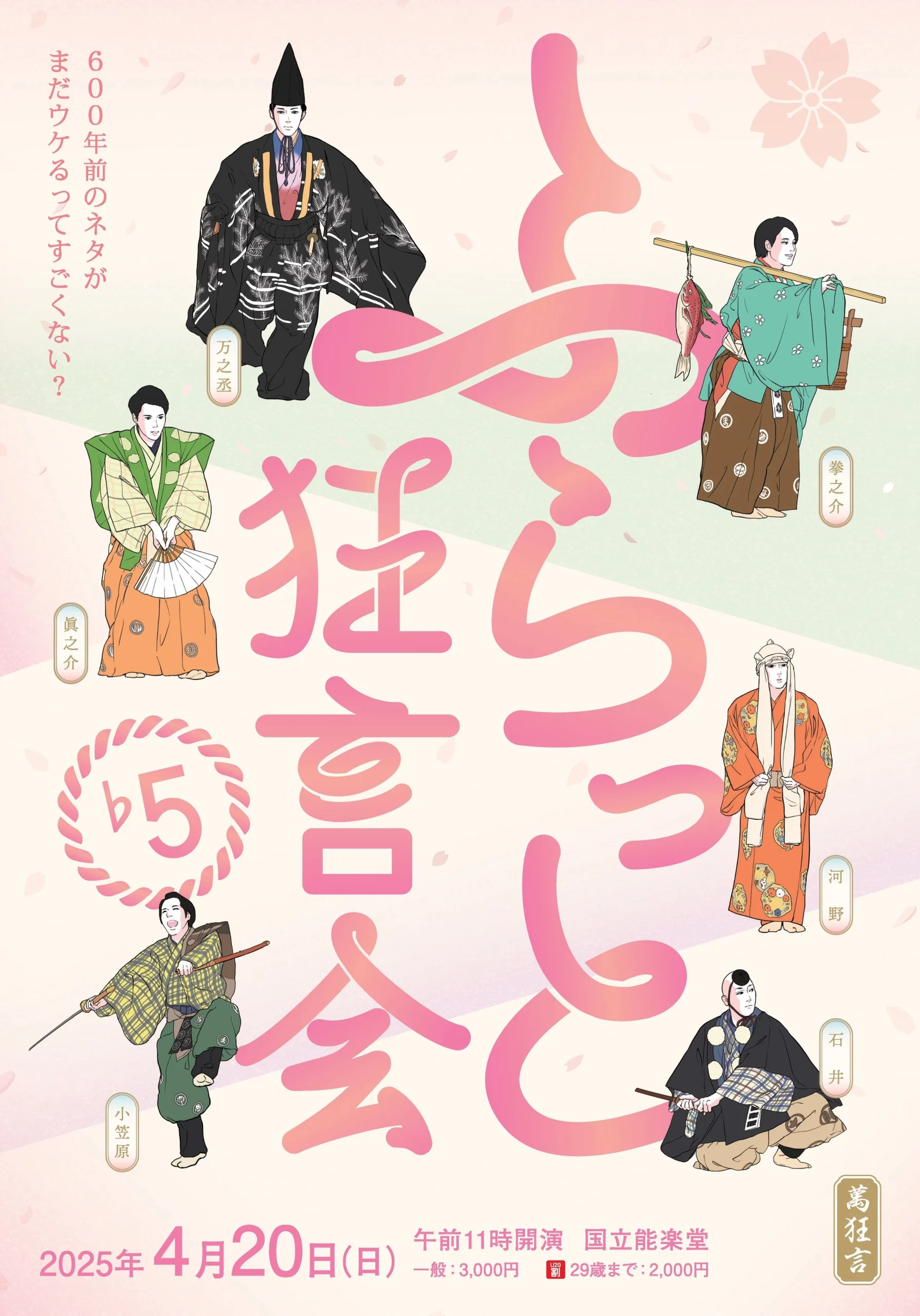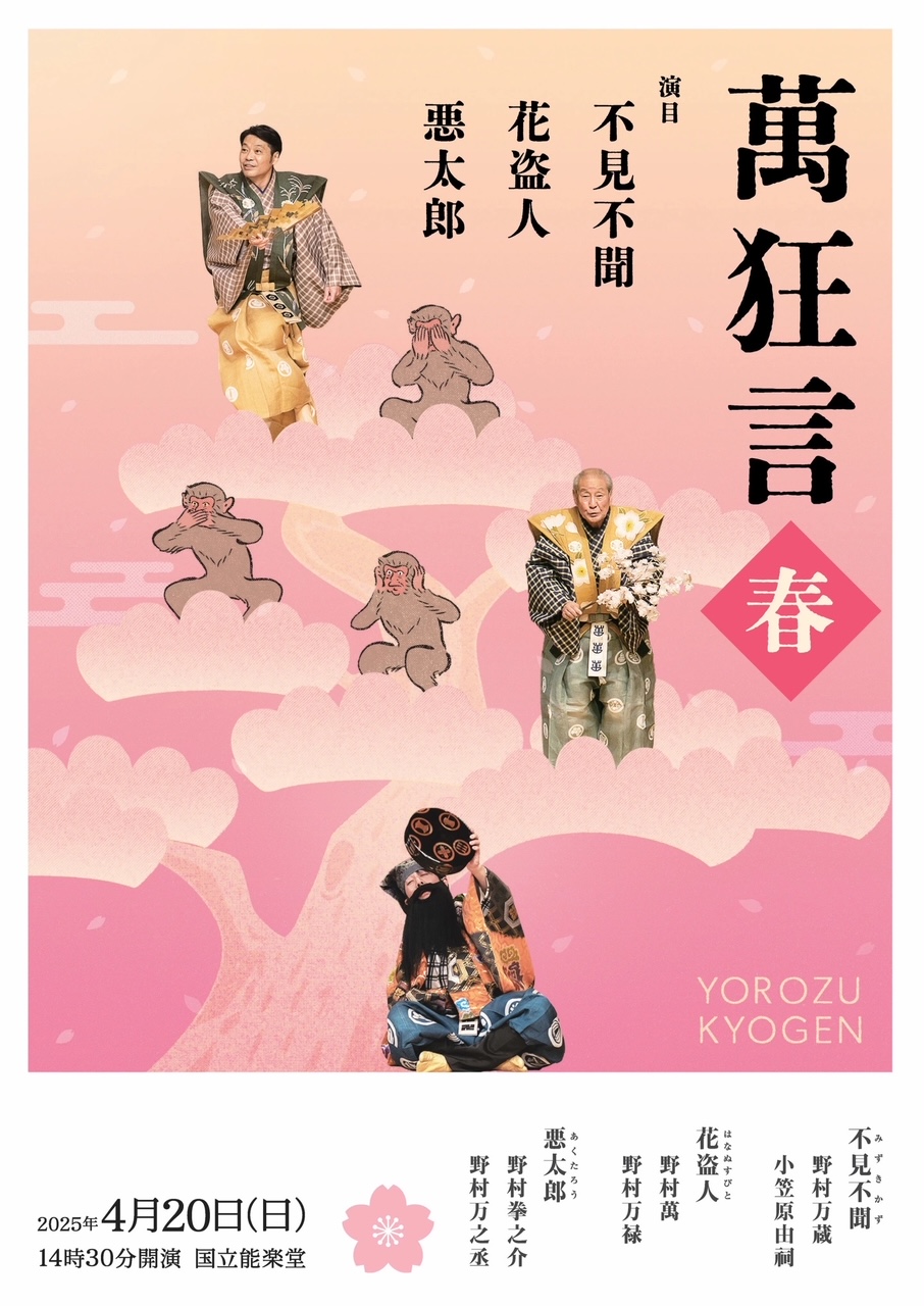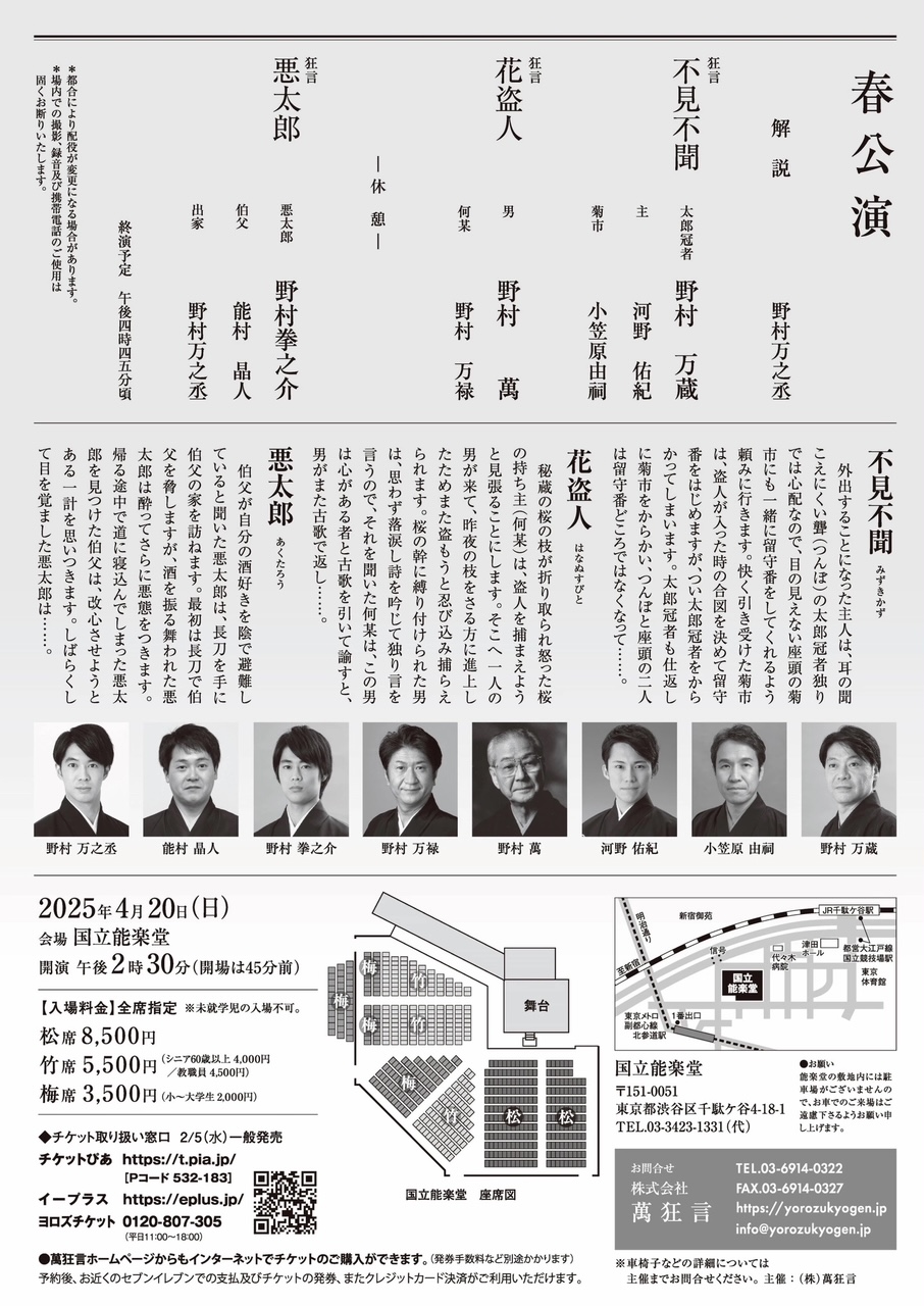 万蔵家一門が出演する定例の春公演。稀曲の「不見不聞」を野村万蔵のシテでご覧いただくほか、野村萬の春らしい演目「花盗人」、拳之介と万之丞の兄弟で息の合った演技が見どころの「悪太郎」をお楽しみください。