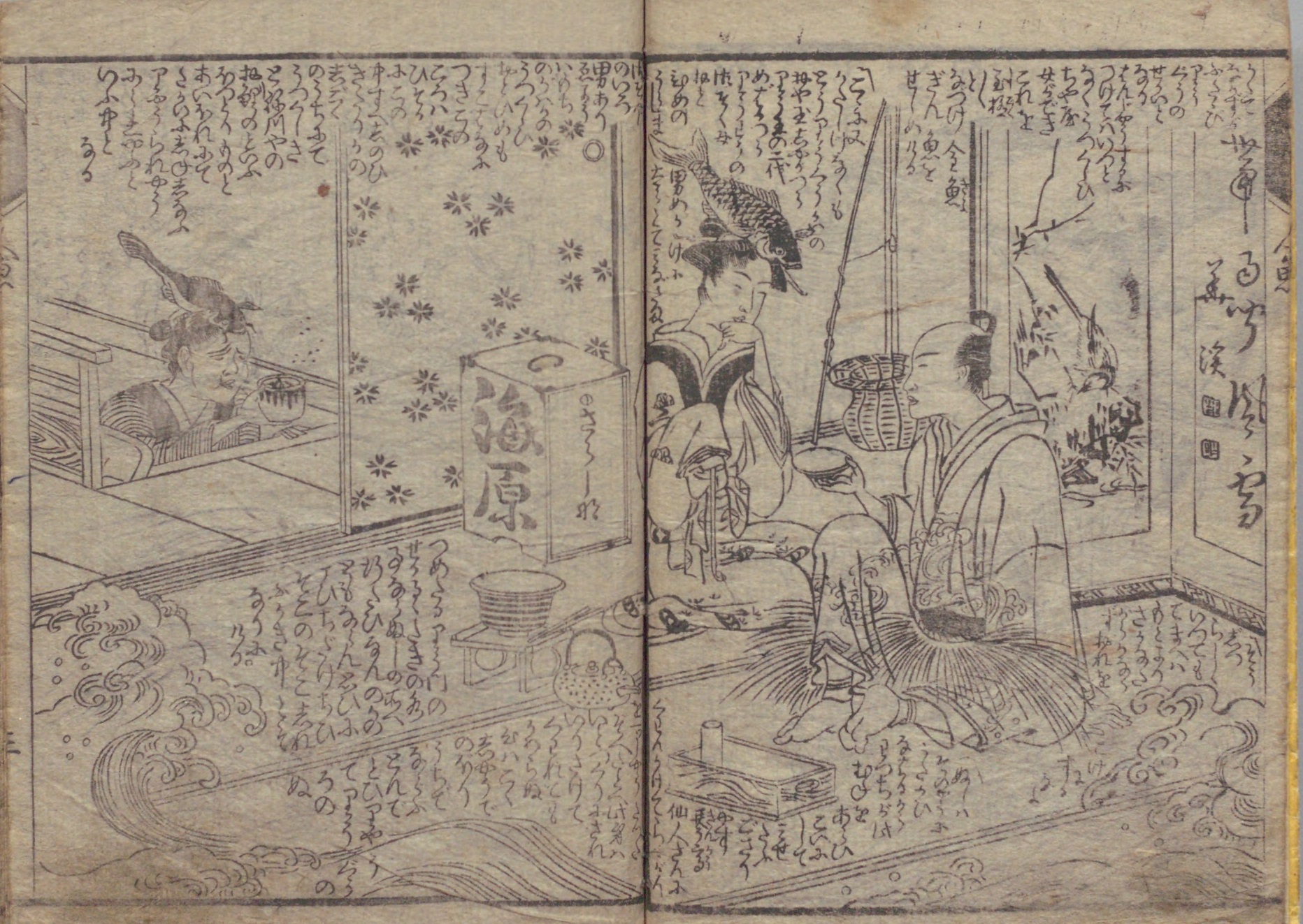 草双紙は表紙の色で内容が分かれ、黄表紙(きびょうし)は成人向け、赤本は童話、黒本は歴史と歌舞伎のあらすじ、青本は恋愛や滑稽(こっけい)もの。これらの本は江戸(=地元)で生まれたことから「地本(じほん)」と呼ばれました。