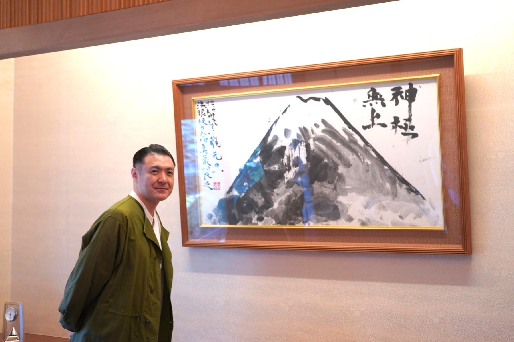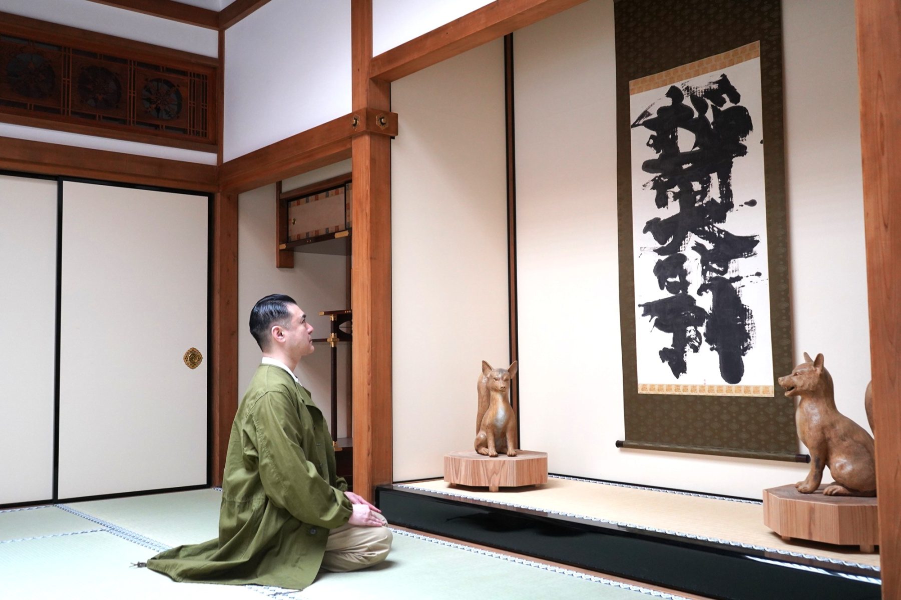 次に通していただいた「正庁の間」は、入った瞬間にぴんと張り詰めたような空気が流れていて、特別な場所だというのが伝わってきました。床の間に飾られた棟方志功による書を見た織太夫さんは、「すごいですね」としばし無言で拝見。掛け軸からはみ出すかのような雄大な筆致の「稲荷大明神」から、エネルギーを受け取られているようでした。